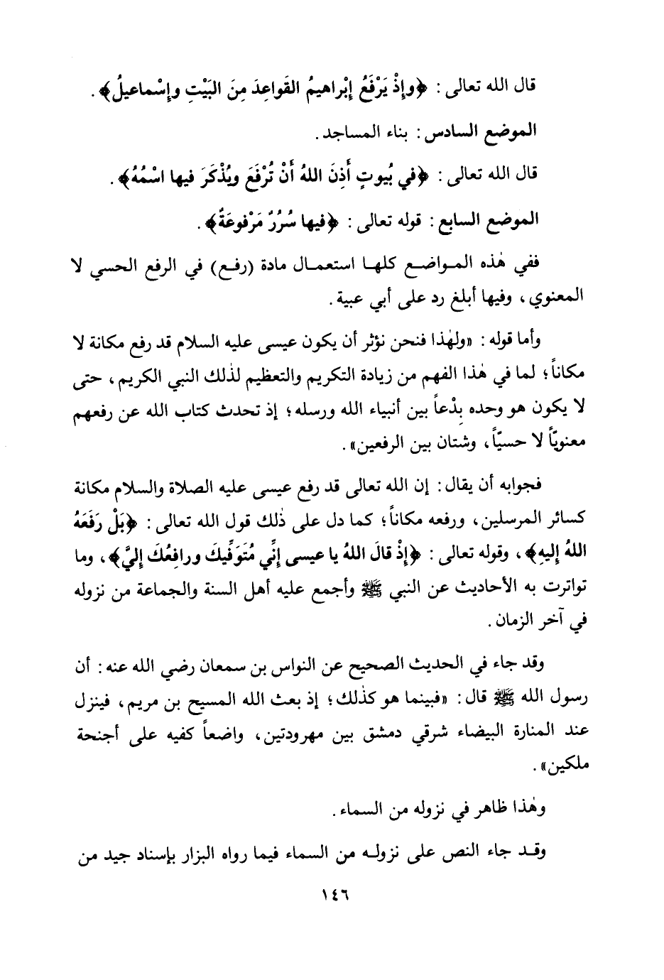 فجوابه أن يقال: إن الله تعالى قد رفع عيسى عليه الصلاة والسلام مكانة كسائر المسلمين، ورفعه مكانا؛ كما دل على ذلك قول الله تعالى: {بَلْ رَفَعَهُ اللَّهُ إِلَيْهِ} ، وقوله تعالى: {إِذْ قَالَ اللَّهُ يَاعِيسَى إِنِّي مُتَوَفِّيكَ وَرَافِعُكَ إِلَيَّ} ، وما تواترت به الأحاديث عن النبي صلى الله عليه وسلم وأجمع عليه أهل السنة والجماعة من نزوله في آخر الزمان.