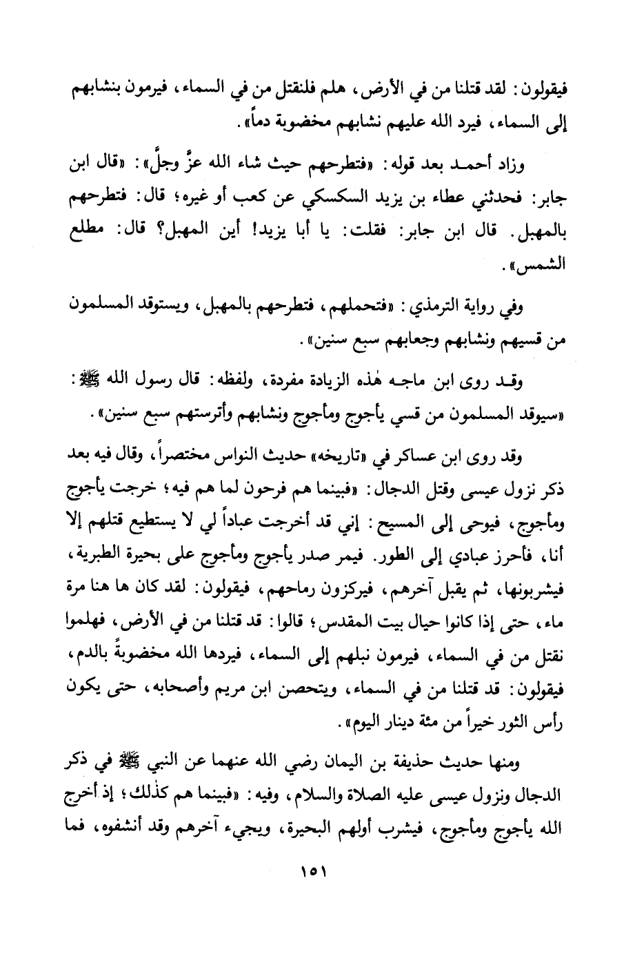 ومنها حديث حذيفة بن اليمان رضي الله عنهما عن النبي صلى الله عليه وسلم في ذكر الدجال ونزول عيسى عليه الصلاة والسلام، وفيه: «فبينما هم كذلك؛ إذ أخرج الله يأجوج ومأجوج، فيشرب أولهم البحيرة، ويجيء آخرهم وقد أنشفوه، فما»