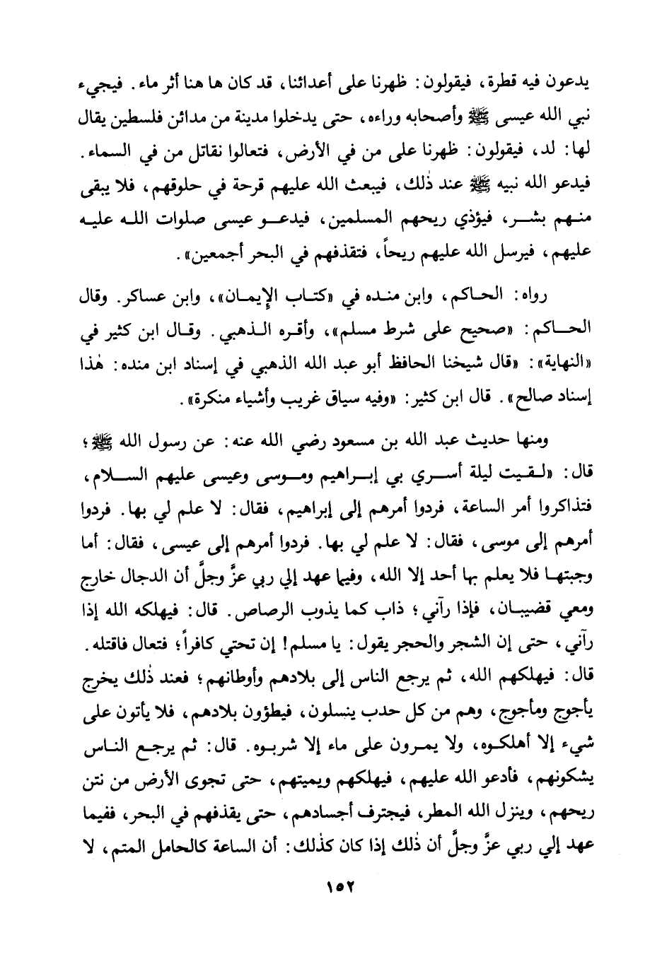 ومنها حديث عبد الله بن مسعود رضي الله عنه: عن رسول الله صلى الله عليه وسلم؛ قال: «لقيت ليلة أسري بي إبراهيم وموسى وعيسى عليهم السلام، فتذاكروا أمر الساعة، فردوا أمرهم إلى إبراهيم، فقال: لا علم لي بها. فردوا أمرهم إلى موسى، فقال: لا علم لي بها. فردوا أمرهم إلى عيسى، فقال: أما وجبتها فلا يعلم بها أحد إلا الله، وفيما عهد إلي ربي عز وجل أن الدجال خارج ومعي قضيبان، فإذا رآني؛ ذاب كما يذوب الرصاص. قال: فيهلكه الله إذا رآني، حتى إن الشجر والحجر يقول: يا مسلم! إن تحتي كافرا؛ فتعال فاقتله.