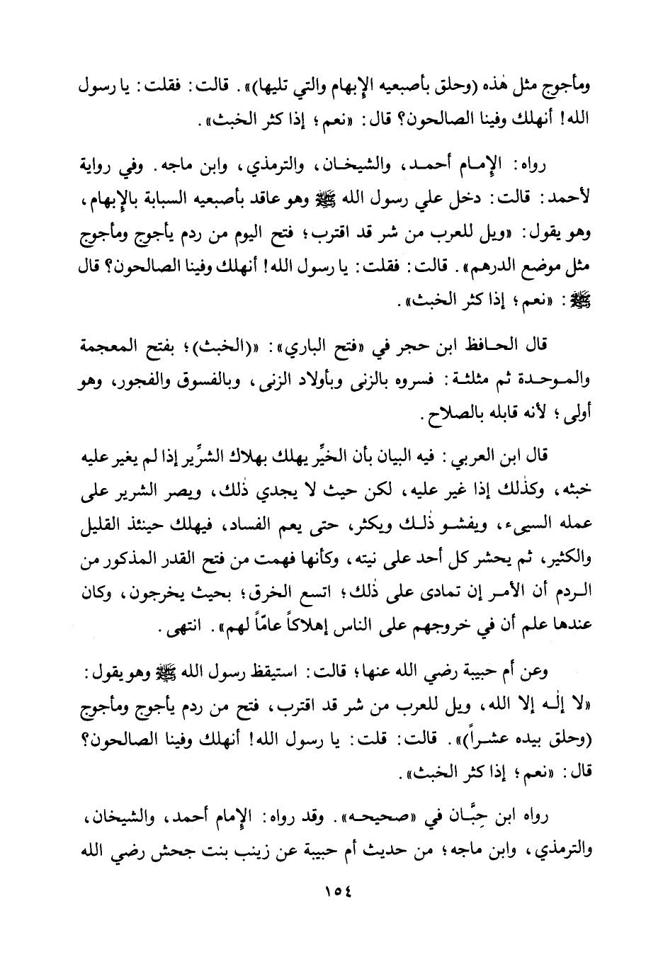 رواه: الإمام أحمد، والشيخان، والترمذي، وابن ماجه. وفي رواية لأحمد: قالت: «دخل علي رسول الله صلى الله عليه وسلم وهو عاقد بأصبعيه السبابة بالإبهام، وهو يقول: " ويل للعرب من شر قد اقترب؛ فتح اليوم من ردم يأجوج ومأجوج مثل موضع الدرهم". قالت: فقلت: يا رسول الله! أنهلك وفينا الصالحون؟ قال صلى الله عليه وسلم: "نعم؛ إذا كثر الخبث» .