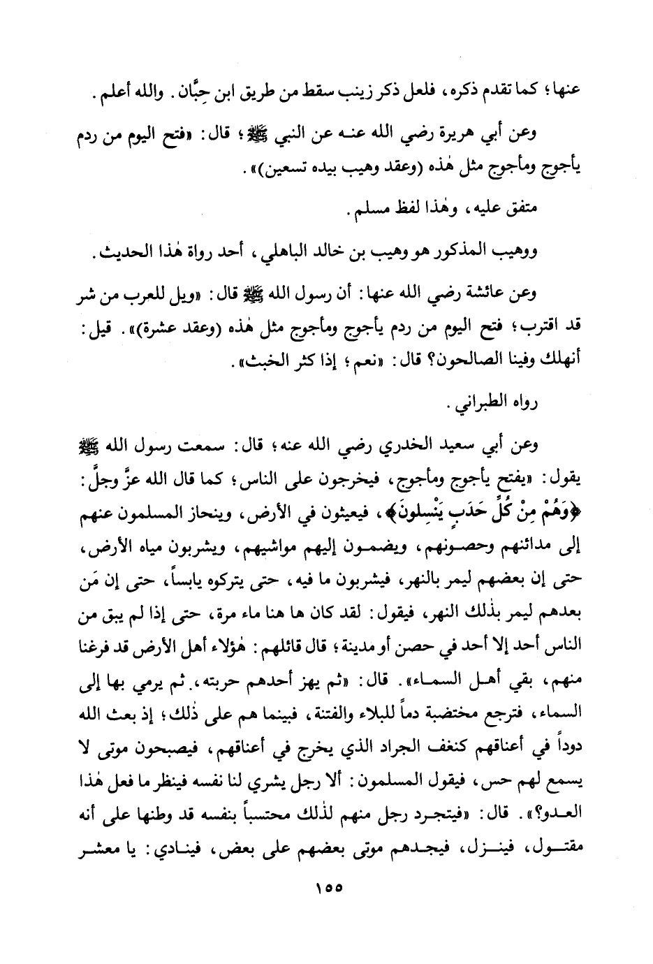 وعن عائشة رضي الله عنها: أن رسول الله صلى الله عليه وسلم قال: «ويل للعرب من شر قد اقترب؛ فتح اليوم من ردم يأجوج ومأجوج مثل هذه "وعقد عشرة"". قيل: أنهلك وفينا الصالحون؟ قال: "نعم؛ إذا كثر الخبث» .