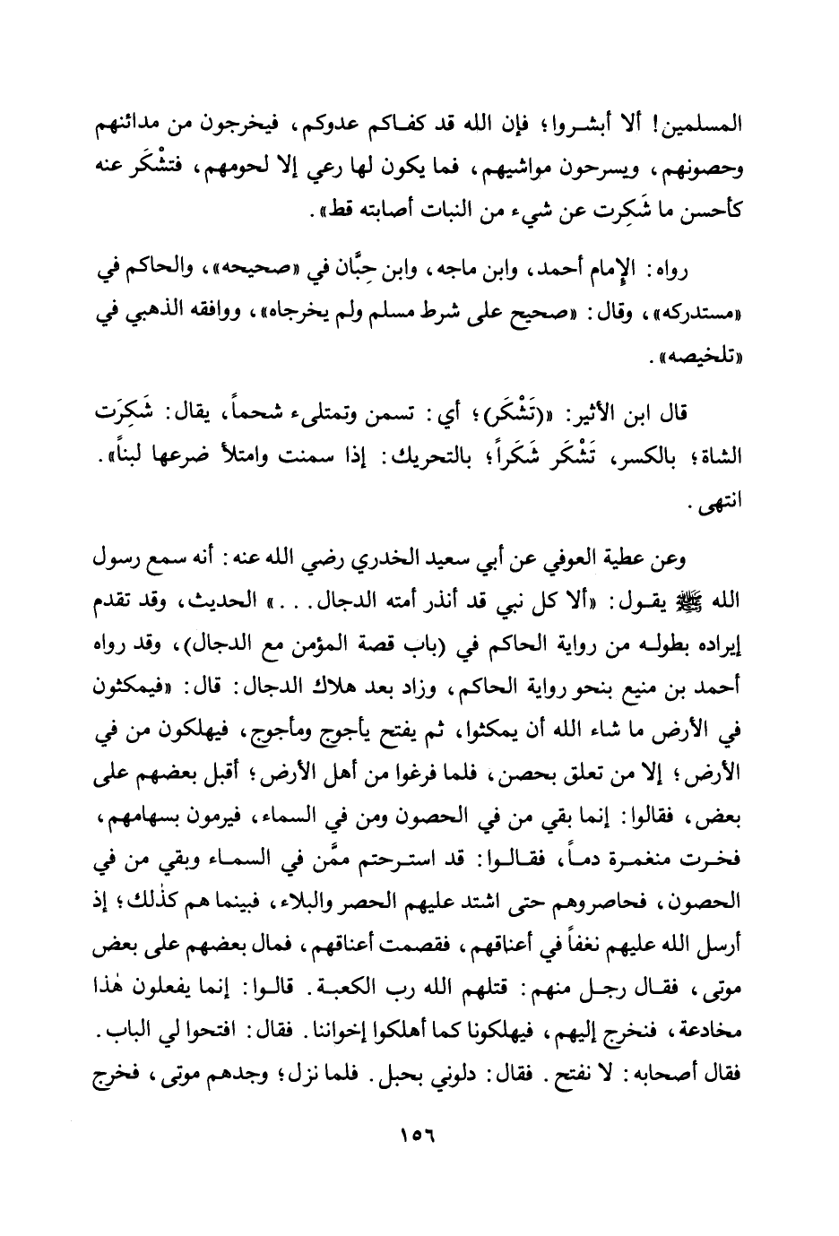 وعن عطية العوفي عن أبي سعيد الخدري رضي الله عنه: أنه سمع رسول الله صلى الله عليه وسلم يقول: «ألا كل نبي قد أنذر أمته الدجال» ... الحديث، وقد تقدم إيراده بطوله من رواية الحاكم في (باب قصة المؤمن مع الدجال) ، وقد رواه أحمد بن منيع بنحو رواية الحاكم، وزاد بعد هلاك الدجال: قال: «فيمكثون في الأرض ما شاء الله أن يمكثوا، ثم يفتح يأجوج ومأجوج، فيهلكون من في الأرض؛ إلا من تعلق بحصن، فلما فرغوا من أهل الأرض؛ أقبل بعضهم على بعض، فقالوا: إنما بقي من في الحصون ومن في السماء، فيرمون بسهامهم، فخرت منغمرة دما، فقالوا: قد استرحتم ممن في السماء وبقي من في الحصون، فحاصروهم حتى اشتد عليهم الحصر والبلاء، فبينما هم كذلك؛ إذ أرسل الله عليهم نغفا في أعناقهم، فقصمت أعناقهم، فمال بعضهم على بعض موتى، فقال رجل منهم: قتلهم الله رب الكعبة. قالوا: إنما يفعلون هذا مخادعة، فنخرج إليهم، فيهلكونا كما أهلكوا إخواننا. فقال: افتحوا لي الباب. فقال أصحابه: لا نفتح. فقال: دلوني بحبل. فلما نزل؛ وجدهم موتى، فخرج»