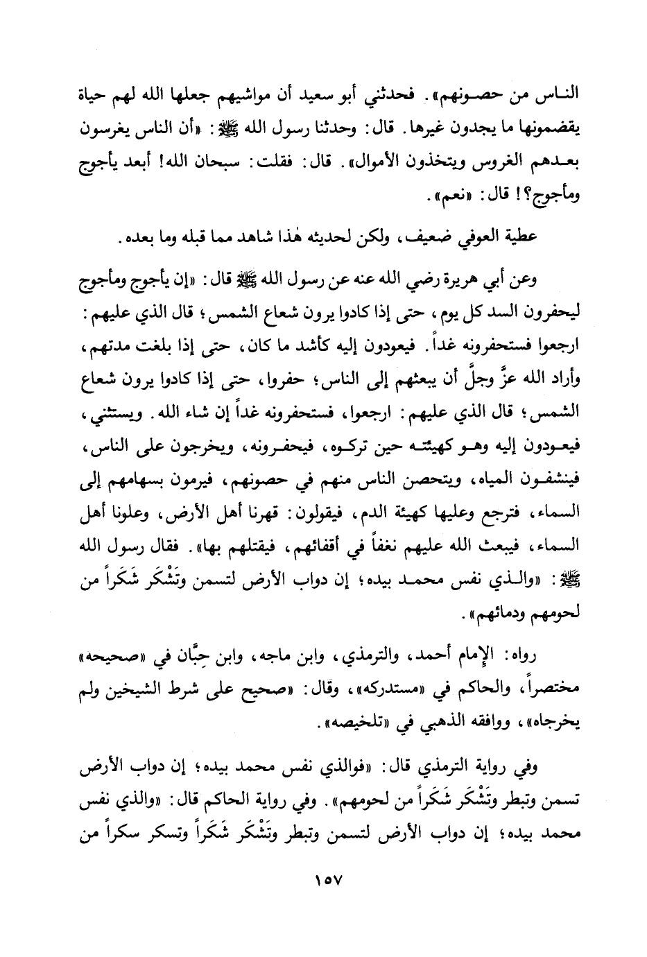 وعن أبي هريرة رضي الله عنه عن رسول الله صلى الله عليه وسلم قال: «إن يأجوج ومأجوج ليحفرون السد كل يوم، حتى إذا كادوا يرون شعاع الشمس؛ قال الذي عليهم: ارجعوا فستحفرونه غدا. فيعودون إليه كأشد ما كان، حتى إذا بلغت مدتهم، وأراد الله عز وجل أن يبعثهم إلى الناس؛ حفروا، حتى إذا كادوا يرون شعاع الشمس؛ قال الذي عليهم: ارجعوا، فستحفرونه غدا إن شاء الله. ويستثني، فيعودون إليه وهو كهيئته حين تركوه، فيحفرونه، ويخرجون على الناس، فينشفون المياه، ويتحصن الناس منهم في حصونهم، فيرمون بسهامهم إلى السماء، فترجع وعليها كهيئة الدم، فيقولون: قهرنا أهل الأرض، وعلونا أهل السماء، فيبعث الله عليهم نغفا في أقفائهم، فيقتلهم بها". فقال رسول الله صلى الله عليه وسلم: "والذي نفس محمد بيده؛ إن دواب الأرض لتسمن وتشكر شكرا من لحومهم ودمائهم» .