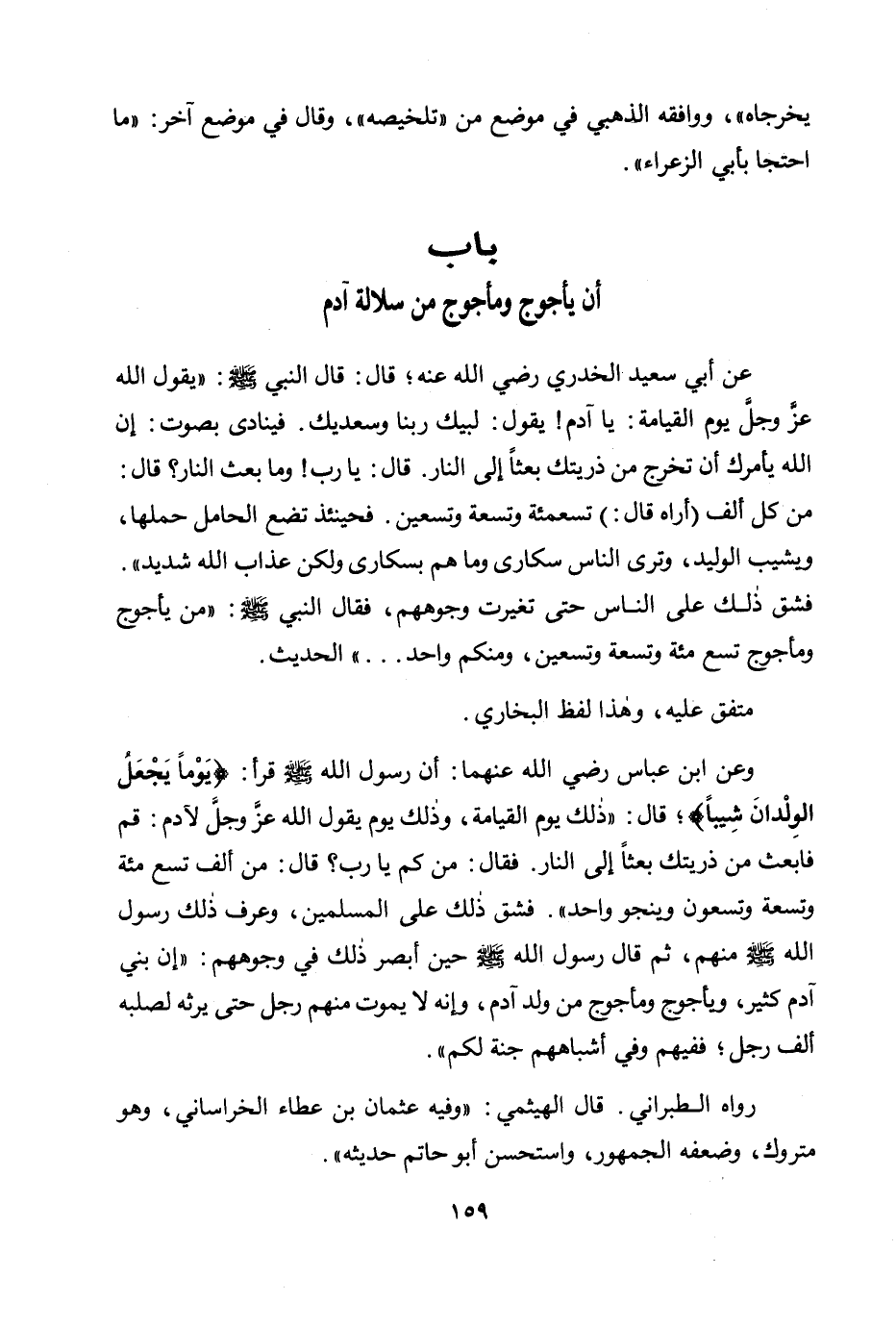 عن أبي سعيد الخدري رضي الله عنه؛ قال: قال النبي صلى الله عليه وسلم: «يقول الله عز وجل يوم القيامة: يا آدم! يقول: لبيك ربنا وسعديك. فينادى بصوت: إن الله يأمرك أن تخرج من ذريتك بعثا إلى النار. قال: يا رب! وما بعث النار؟ قال: من كل ألف (أراه قال:) تسعمائة وتسعة وتسعين. فحينئذ تضع الحامل حملها، ويشيب الوليد، وترى الناس سكارى وما هم بسكارى ولكن عذاب الله شديد". فشق ذلك على الناس حتى تغيرت وجوههم، فقال النبي صلى الله عليه وسلم: "من يأجوج ومأجوج تسع مائة وتسعة وتسعين، ومنكم واحد» ..... الحديث.