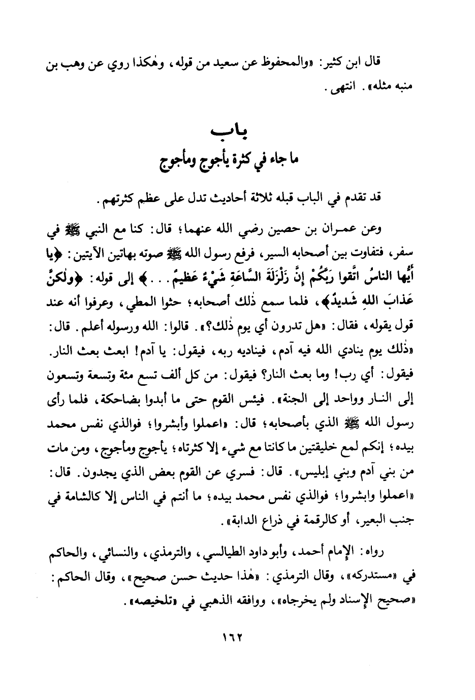 وعن عمران بن حصين رضي الله عنهما؛ قال: «كنا مع النبي صلى الله عليه وسلم في سفر، فتفاوت بين أصحابه السير، فرفع رسول الله صلى الله عليه وسلم صوته بهاتين الآيتين: {يَا أَيُّهَا النَّاسُ اتَّقُوا رَبَّكُمْ إِنَّ زَلْزَلَةَ السَّاعَةِ شَيْءٌ عَظِيمٌ} ... إلى قوله: {وَلَكِنَّ عَذَابَ اللَّهِ شَدِيدٌ} ، فلما سمع ذلك أصحابه؛ حثوا المطي، وعرفوا أنه عند قول يقوله، فقال: "هل تدرون أي يوم ذلك؟ ". قالوا: الله ورسوله أعلم. قال: "ذلك يوم ينادي الله فيه آدم، فيناديه ربه، فيقول: يا آدم! ابعث بعث النار. فيقول: أي رب! وما بعث النار؟ فيقول: من كل ألف تسع مائة وتسعة وتسعون إلى النار وواحد إلى الجنة". فيئس القوم حتى ما أبدوا بضاحكة، فلما رأى رسول الله صلى الله عليه وسلم الذي بأصحابه؛ قال: "اعملوا وأبشروا؛ فوالذي نفس محمد بيده؛ إنكم لمع خليقتين ما كانتا مع شيء إلا كثرتاه؛ يأجوج ومأجوج، ومن مات من بني آدم وبني إبليس". قال: فسري عن القوم بعض الذي يجدون. قال: "اعملوا وأَبشروا؛ فوالذي نفس محمد بيده؛ ما أنتم في الناس إلا كالشامة في جنب البعير، أو كالرقمة في ذراع الدابة» .