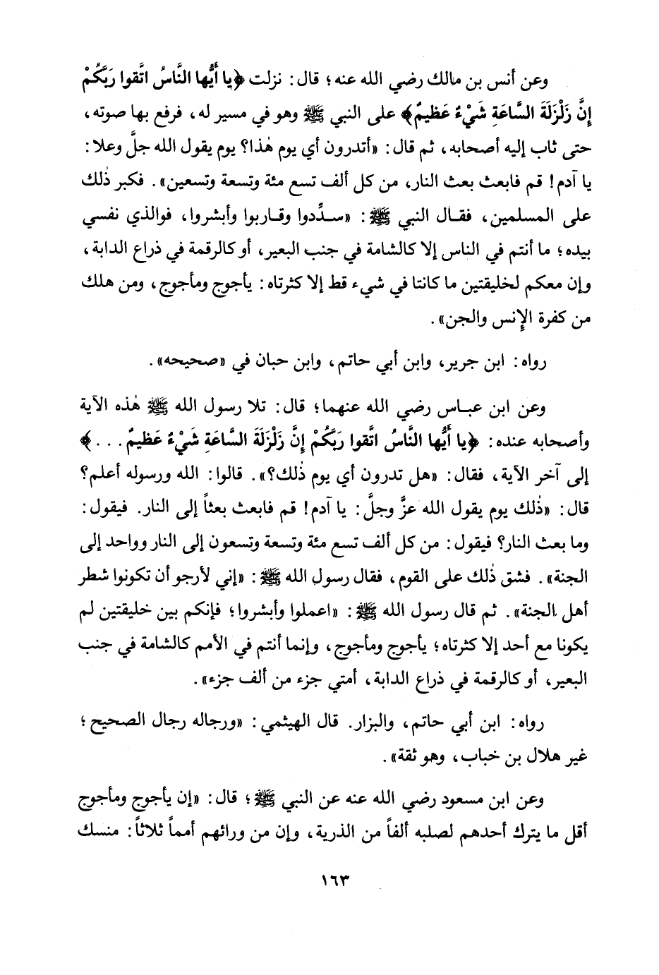 وعن أنس بن مالك رضي الله عنه؛ قال: «نزلت {يَا أَيُّهَا النَّاسُ اتَّقُوا رَبَّكُمْ إِنَّ زَلْزَلَةَ السَّاعَةِ شَيْءٌ عَظِيمٌ} على النبي صلى الله عليه وسلم وهو في مسير له، فرفع بها صوته، حتى ثاب إليه أصحابه، ثم قال: "أتدرون أي يوم هذا؟ يوم يقول الله جل وعلا: يا آدم! قم فابعث بعث النار، من كل ألف تسع مائة وتسعة وتسعين". فكبر ذلك على المسلمين، فقال النبي صلى الله عليه وسلم: "سددوا وقاربوا وأبشروا، فوالذي نفسي بيده؛ ما أنتم في الناس إلا كالشامة في جنب البعير، أو كالرقمة في ذراع الدابة، وإن معكم لخليقتين ما كانتا في شيء قط إلا كثرتاه: يأجوج ومأجوج، ومن هلك من كفرة الإنس والجن» .