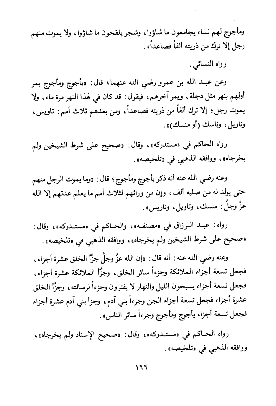 وعن عبد الله بن عمرو رضي الله عنهما؛ قال: "يأجوج ومأجوج يمر أولهم بنهر مثل دجلة، ويمر آخرهم، فيقول: قد كان في هذا النهر مرة ماء، ولا يموت رجل؛ إلا ترك ألفا من ذريته فصاعدا، ومن بعدهم ثلاث أمم: تاويس، وتاويل، وناسك "أو منسك"".