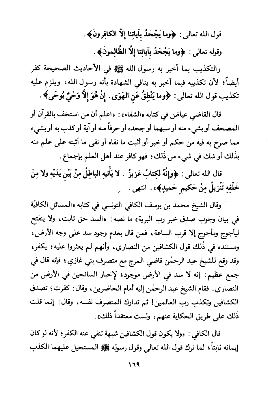 قال القاضي عياض في كتابه "الشفاء": "اعلم أن من استخف بالقرآن أو المصحف أو بشيء منه أو سبهما أو جحده أو حرفا منه أو آية أو كذب به أو بشيء مما صرح به فيه من حكم أو خبر أو أثبت ما نفاه أو نفى ما أثبته على علم منه بذلك أو شك في شيء من ذلك؛ فهو كافر عند أهل العلم بإجماع.