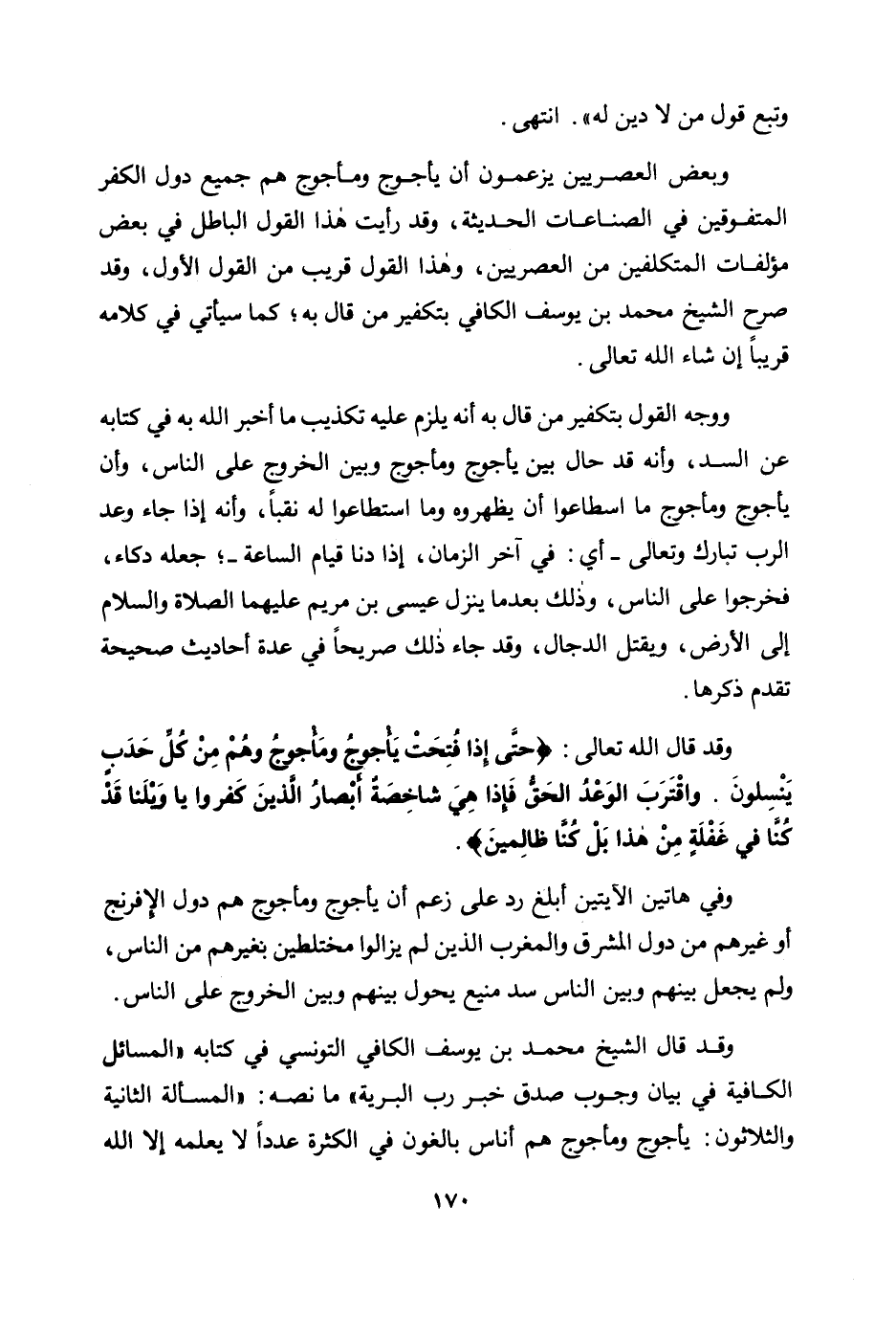 وقد قال الشيخ محمد بن يوسف الكافي التونسي في كتابه "المسائل الكافية في بيان وجوب صدق خبر رب البرية" ما نصه: "المسألة الثانية والثلاثون: يأجوج ومأجوج هم أناس بالغون في الكثرة عددا لا يعلمه إلا الله