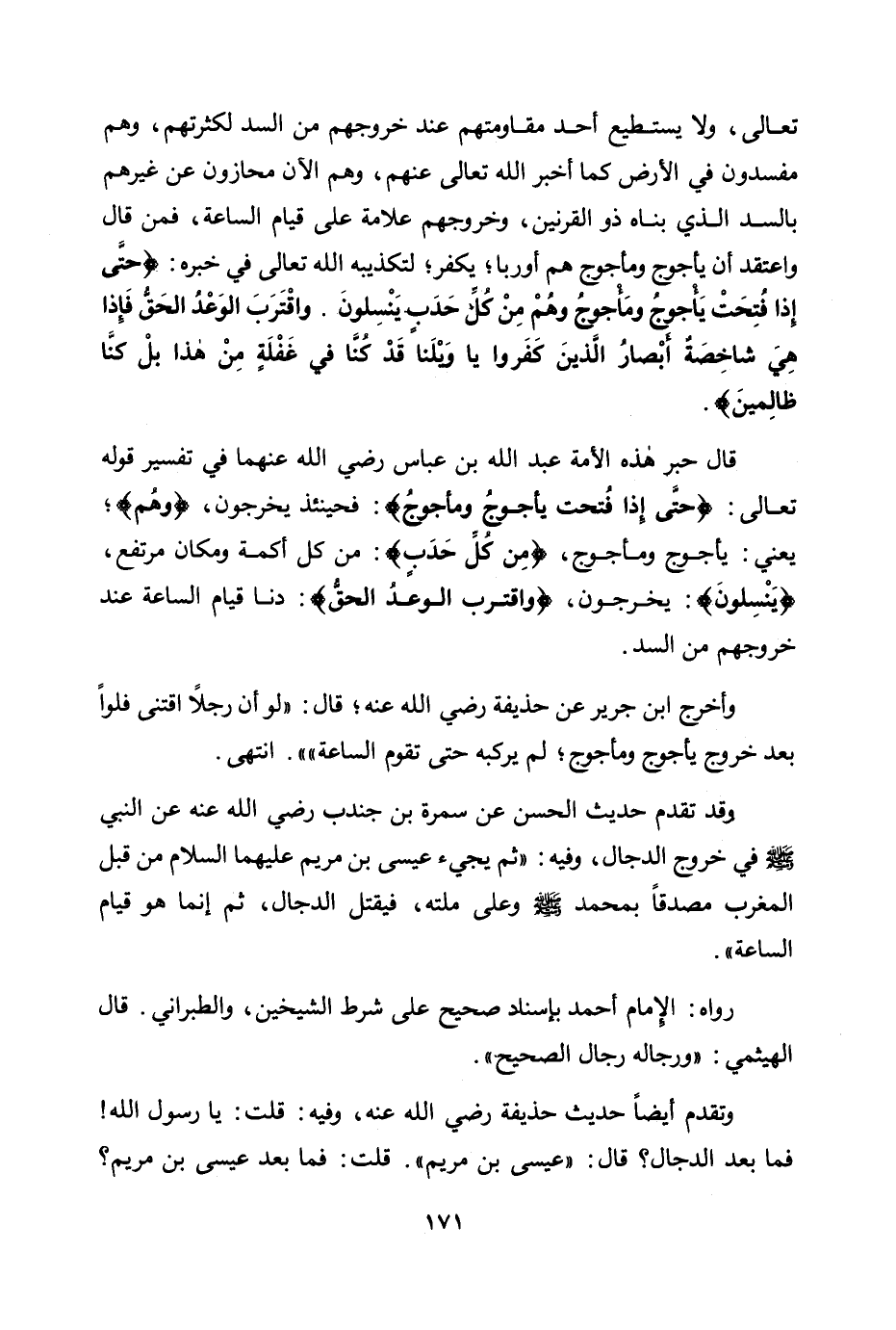 قال حبر هذه الأمة عبد الله بن عباس رضي الله عنهما في تفسير قوله تعالى: {حَتَّى إِذَا فُتِحَتْ يَأْجُوجُ وَمَأْجُوجُ} : فحينئذ يخرجون، وهم؛ يعني: يأجوج ومأجوج، {مِنْ كُلِّ حَدَبٍ} : من كل أكمة ومكان مرتفع، ينسلون: يخرجون، {وَاقْتَرَبَ الْوَعْدُ الْحَقُّ} : دنا قيام الساعة عند خروجهم من السد.