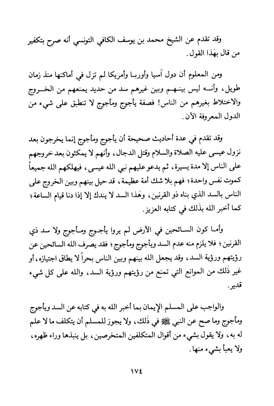 والواجب على المسلم الإيمان بما أخبر الله به في كتابه عن السد ويأجوج ومأجوج وما صح عن النبي صلى الله عليه وسلم في ذلك، ولا يجوز للمسلم أن يتكلف ما لا علم له به، ولا يقول بشيء من أقوال المتكلفين المتخرصين، بل ينبذها وراء ظهره، ولا يعبأ بشيء منها.