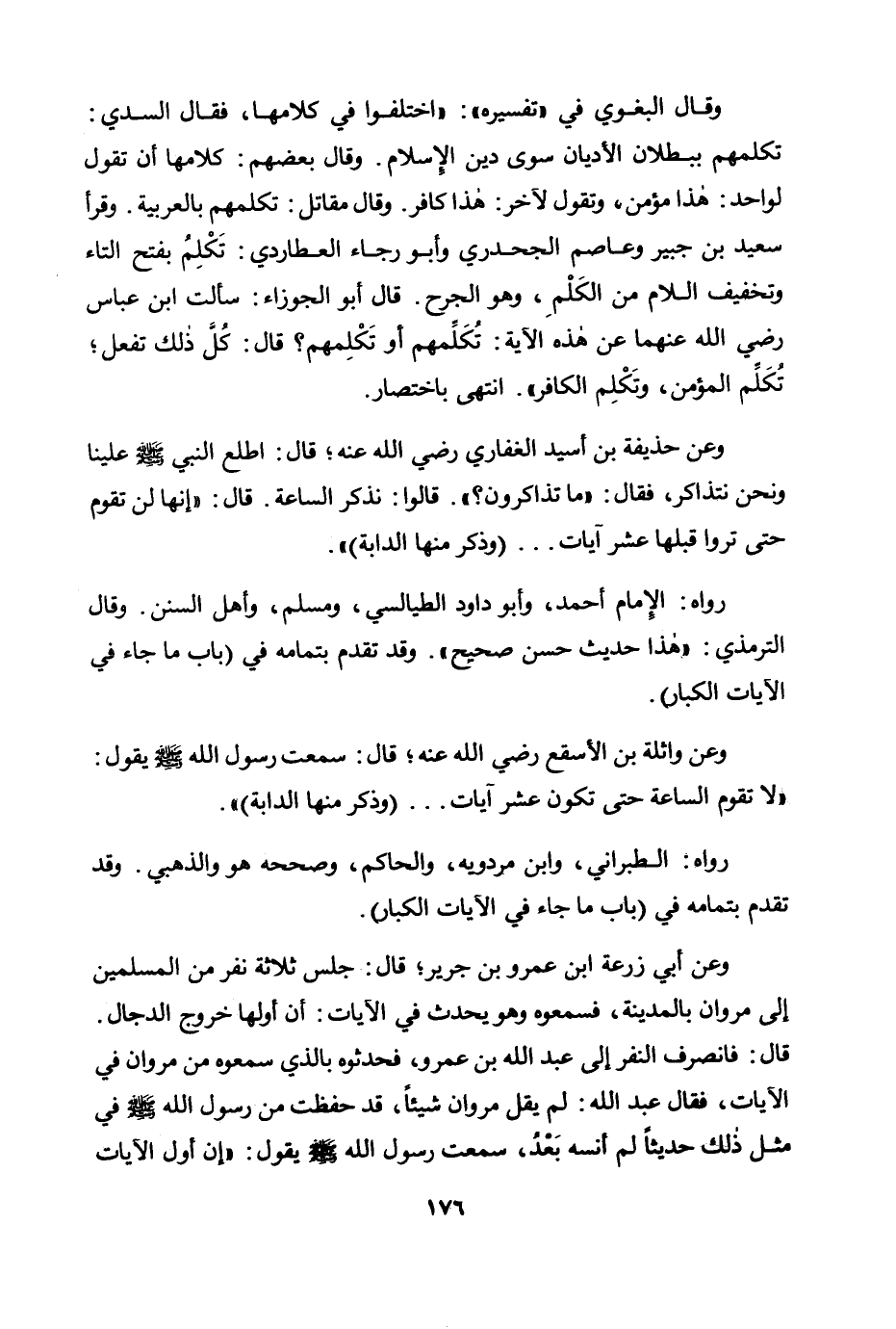 وعن حذيفة بن أسيد الغفاري رضي الله عنه؛ قال: «اطلع النبي صلى الله عليه وسلم علينا ونحن نتذاكر، فقال: "ما تذاكرون؟ ". قالوا: نذكر الساعة. قال: " إنها لن تقوم حتى تروا قبلها عشر آيات ... (وذكر منها الدابة) » .