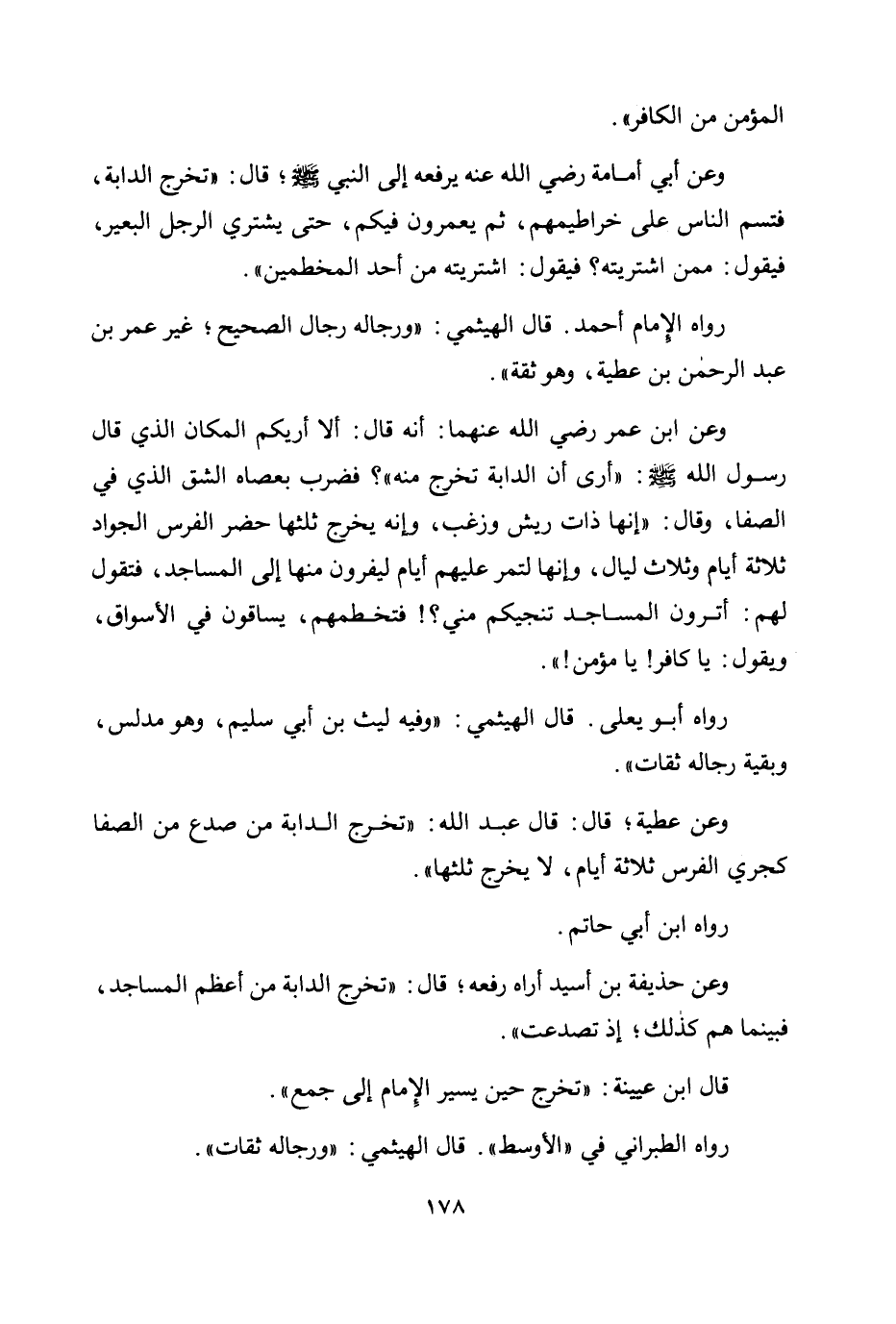 «وعن ابن عمر رضي الله عنهما: أنه قال: ألا أريكم المكان الذي قال رسول الله صلى الله عليه وسلم: "أرى أن الدابة تخرج منه"؟ فضرب بعصاه الشق الذي في الصفا، وقال: "إنها ذات ريش وزغب، وإنه يخرج ثلثها حضر الفرس الجواد ثلاثة أيام وثلاث ليال، وإنها لتمر عليهم أيام ليفرون منها إلى المساجد، فتقول لهم: أترون المساجد تنجيكم مني؟! فتخطمهم، يساقون في الأسواق، ويقول: يا كافر! يا مؤمن! ".»