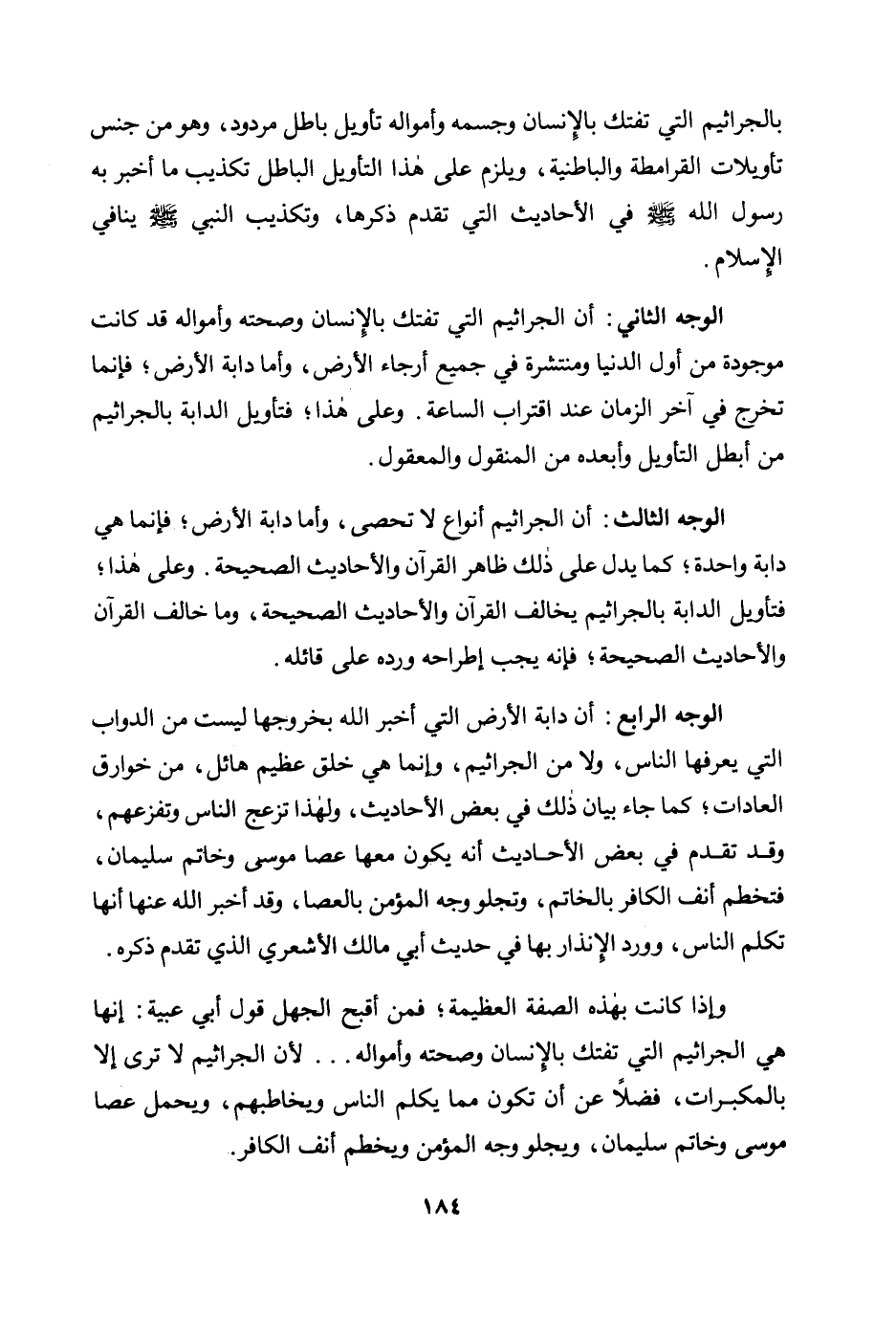 الوجه الثاني: أن الجراثيم التي تفتك بالإنسان وصحته وأمواله قد كانت موجودة من أول الدنيا ومنتشرة في جميع أرجاء الأرض، وأما دابة الأرض؛ فإنما تخرج في آخر الزمان عند اقتراب الساعة. وعلى هذا؛ فتأويل الدابة بالجراثيم من أبطل التأويل وأبعده من المنقول والمعقول.