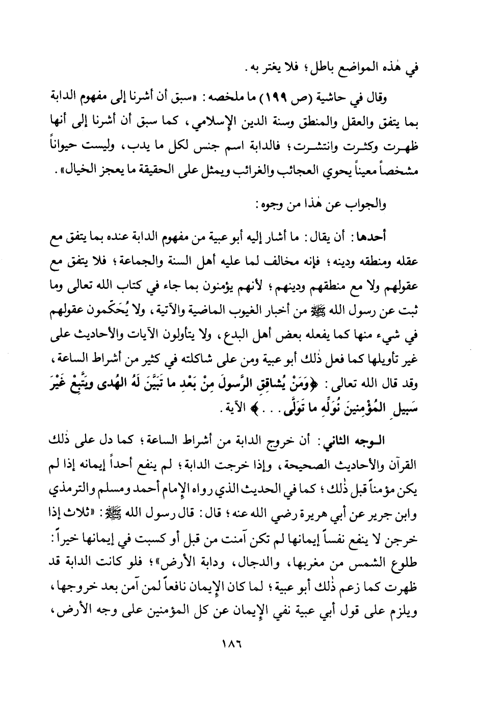 أحدها: أن يقال: ما أشار إليه أبو عبية من مفهوم الدابة عنده بما يتفق مع عقله ومنطقه ودينه؛ فإنه مخالف لما عليه أهل السنة والجماعة؛ فلا يتفق مع عقولهم ولا مع منطقهم ودينهم؛ لأنهم يؤمنون بما جاء في كتاب الله تعالى وما ثبت عن رسول الله صلى الله عليه وسلم من أخبار الغيوب الماضية والآتية، ولا يحكمون عقولهم في شيء منها كما يفعله بعض أهل البدع، ولا يتأولون الآيات والأحاديث على غير تأويلها كما فعل ذلك أبو عبية ومن على شاكلته في كثير من أشراط الساعة، وقد قال الله تعالى: {وَمَنْ يُشَاقِقِ الرَّسُولَ مِنْ بَعْدِ مَا تَبَيَّنَ لَهُ الْهُدَى وَيَتَّبِعْ غَيْرَ سَبِيلِ الْمُؤْمِنِينَ نُوَلِّهِ مَا تَوَلَّى} ... الآية.