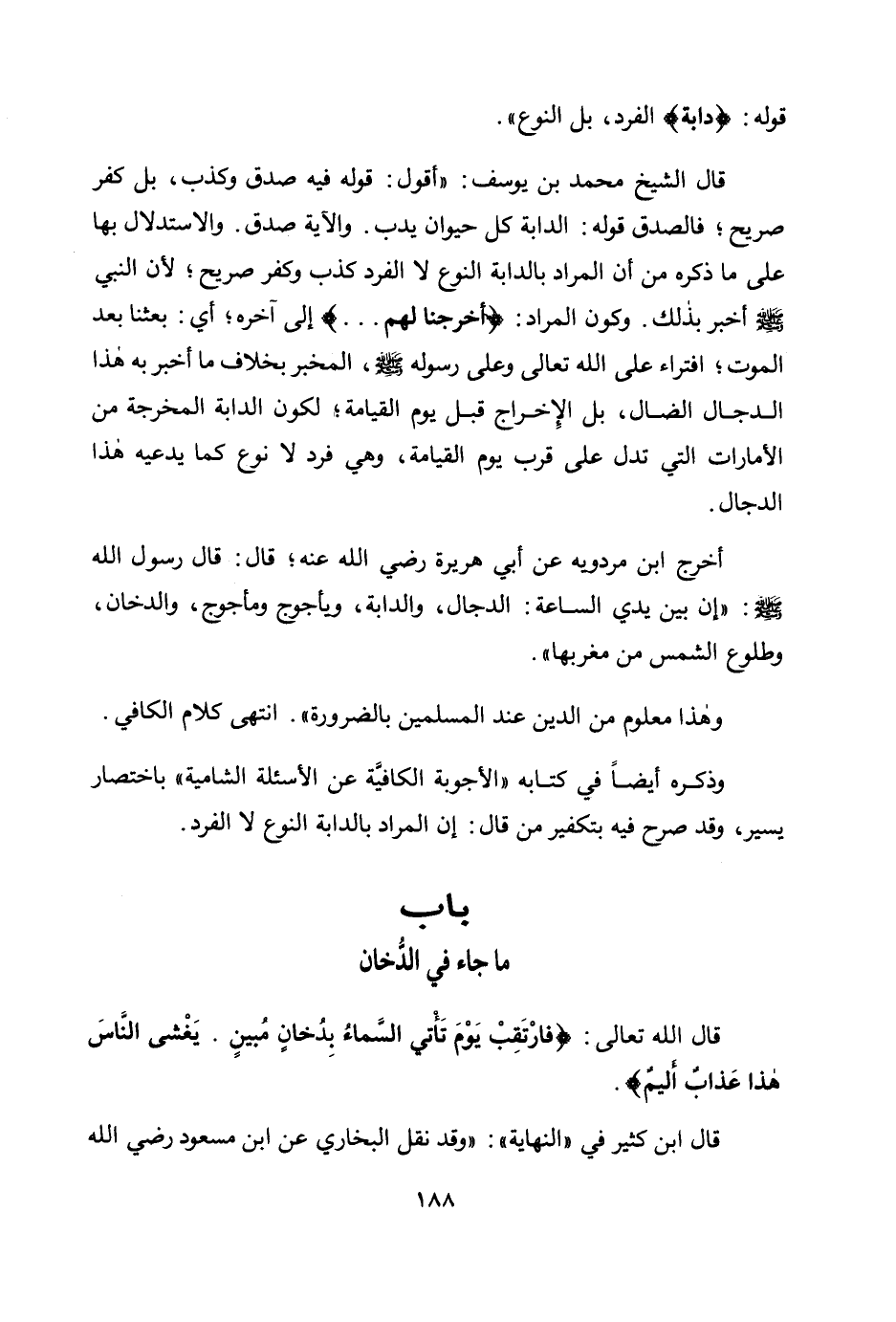 وذكره أيضا في كتابه "الأجوبة الكافية عن الأسئلة الشامية" باختصار يسير، وقد صرح فيه بتكفير من قال: إن المراد بالدابة النوع لا الفرد.