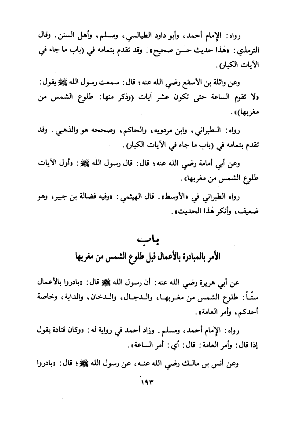 وعن واثلة بن الأسقع رضي الله عنه؛ قال: سمعت رسول الله صلى الله عليه وسلم يقول: «لا تقوم الساعة حتى تكون عشر آيات (وذكر منها: طلوع الشمس من مغربها) » .