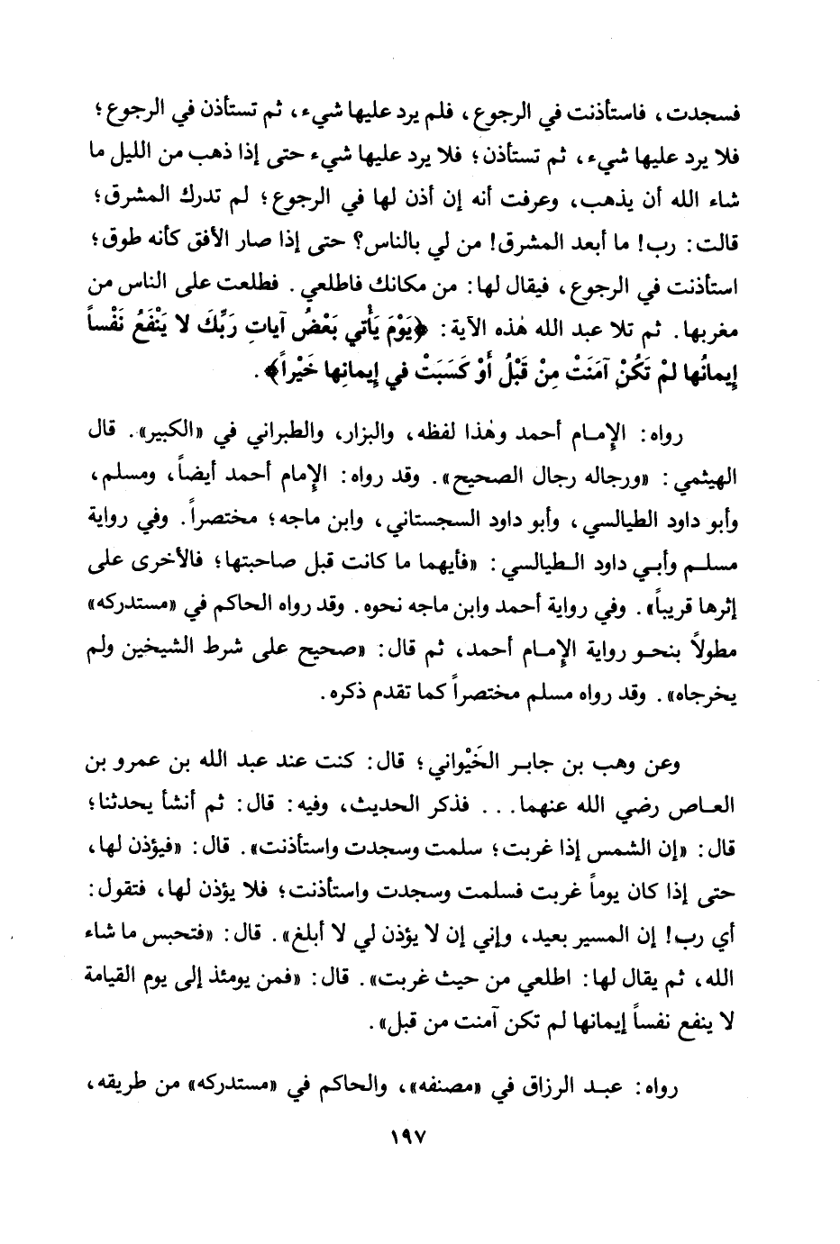 «فسجدت، فاستأذنت في الرجوع، فلم يرد عليها شيء، ثم تستأذن في الرجوع؛ فلا يرد عليها شيء، ثم تستأذن؛ فلا يرد عليها شيء، حتى إذا ذهب من الليل ما شاء الله أن يذهب، وعرفت أنه إن أذن لها في الرجوع؛ لم تدرك المشرق؛ قالت: رب! ما أبعد المشرق! من لي بالناس؟ حتى إذا صار الأفق كأنه طوق؛ استأذنت في الرجوع، فيقال لها: من مكانك فاطلعي. فطلعت على الناس من مغربها. ثم تلا عبد الله هذه الآية: {يَوْمَ يَأْتِي بَعْضُ آيَاتِ رَبِّكَ لَا يَنْفَعُ نَفْسًا إِيمَانُهَا لَمْ تَكُنْ آمَنَتْ مِنْ قَبْلُ أَوْ كَسَبَتْ فِي إِيمَانِهَا خَيْرًا} » .