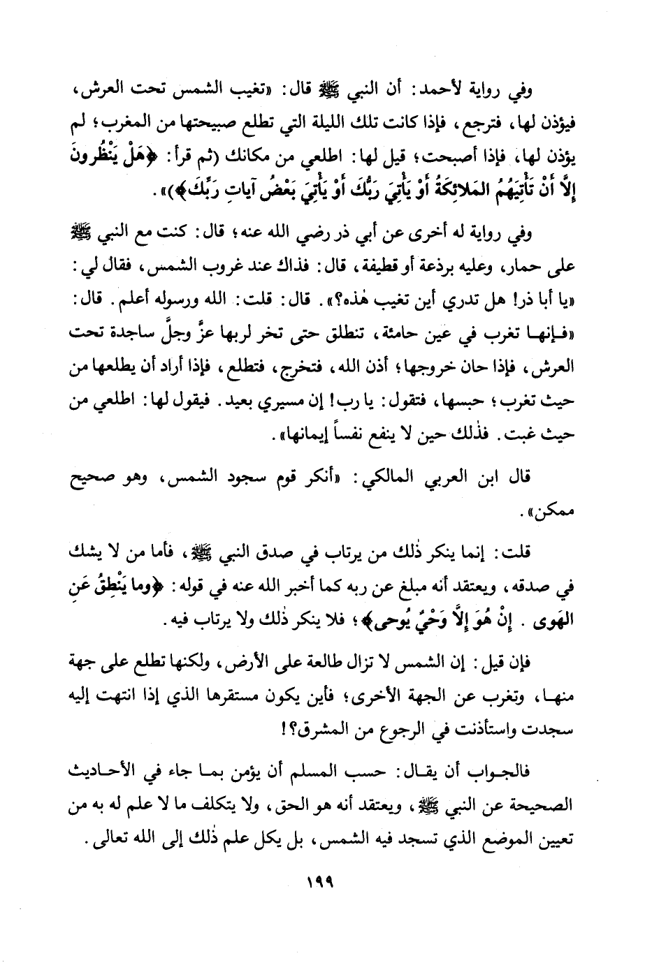 وفي رواية له أخرى «عن أبي ذر رضي الله عنه؛ قال: كنت مع النبي صلى الله عليه وسلم على حمار، وعليه برذعة أو قطيفة، قال: فذاك عند غروب الشمس، فقال لي: " يا أبا ذر! هل تدري أين تغيب هذه؟ ". قال: قلت: الله ورسوله أعلم. قال: "فإنها تغرب في عين حامئة، تنطلق حتى تخر لربها عز وجل ساجدة تحت العرش، فإذا حان خروجها؛ أذن الله، فتخرج، فتطلع، فإذا أراد أن يطلعها من حيث تغرب؛ حبسها، فتقول: يا رب! إن مسيري بعيد. فيقول لها: اطلعي من حيث غبت. فذلك حين لا ينفع نفسا إيمانها» .