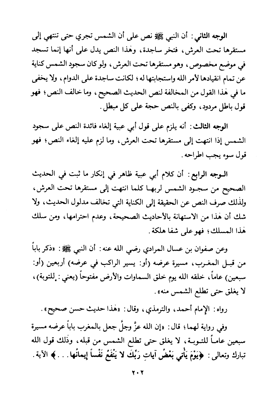 الوجه الرابع: أن كلام أبي عبية ظاهر في إنكار ما ثبت في الحديث صحيح من سجود الشمس لربها كلما انتهت إلى مستقرها تحت العرش، ولذلك صرف النص عن الحقيقة إلى الكناية التي تخالف مدلول الحديث، ولا شك أن هذا من الاستهانة بالأحاديث الصحيحة، وعدم احترامها، ومن سلك هذا المسلك؛ فهو على شفا هلكة.