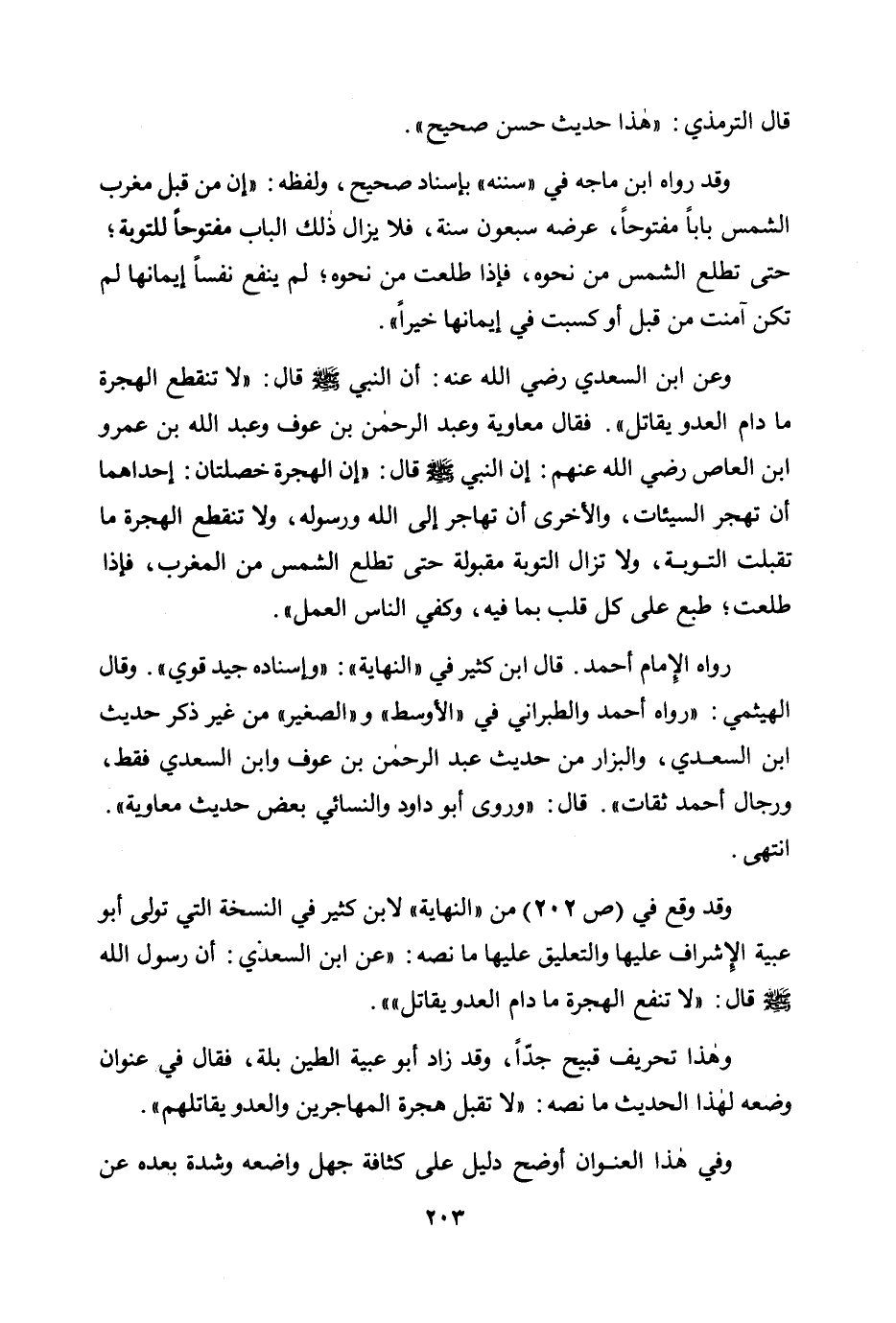وقد وقع في (ص202) من "النهاية" لابن كثير في النسخة التي تولى أبو عبية الإشراف عليها والتعليق عليها ما نصه: "عن ابن السعدي: أن رسول الله صلى الله عليه وسلم قال: «لا تنفع الهجرة ما دام العدو يقاتل» .