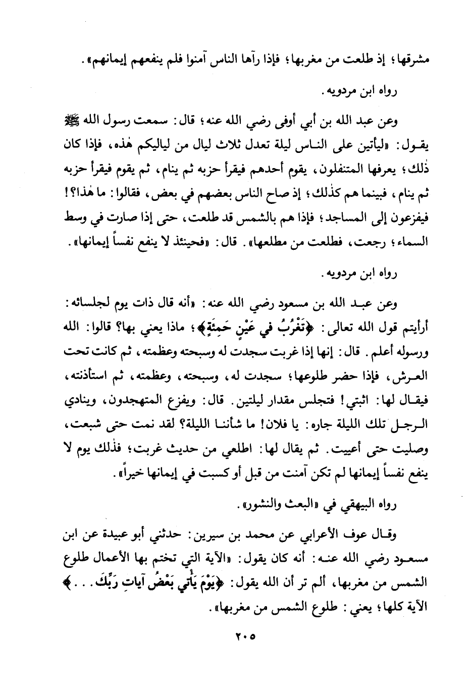وعن عبد الله بن مسعود رضي الله عنه: "أنه قال ذات يوم لجلسائه: أرأيتم قول الله تعالى: {تَغْرُبُ فِي عَيْنٍ حَمِئَةٍ} ؛ ماذا يعني بها؟ قالوا: الله ورسوله أعلم. قال: إنها إذا غربت سجدت له وسبحته وعظمته، ثم كانت تحت العرش، فإذا حضر طلوعها؛ سجدت له، وسبحته، وعظمته، ثم استأذنته، فيقال لها: اثبتي! فتجلس مقدار ليلتين. قال: ويفزع المتهجدون، وينادي الرجل تلك الليلة جاره: يا فلان! ما شأننا الليلة؟ لقد نمت حتى شبعت، وصليت حتى أعييت. ثم يقال لها: اطلعي من حديث غربت؛ فذلك يوم لا ينفع نفسا إيمانها لم تكن آمنت من قبل أو كسبت في إيمانها خيرا".