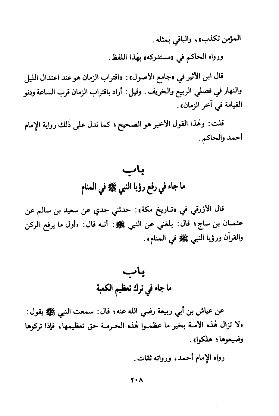 قال الأزرقي في "تاريخ مكة": حدثني جدي عن سعيد بن سالم عن عثمان بن ساج؛ قال: بلغني عن النبي صلى الله عليه وسلم: أنه قال: «أول ما يرفع الركن والقرآن ورؤيا النبي صلى الله عليه وسلم في المنام» .