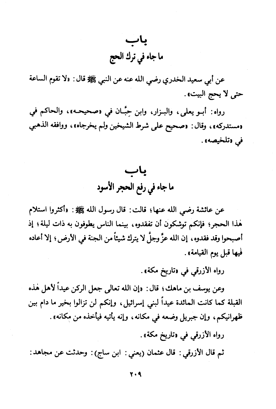 عن عائشة رضي الله عنها؛ قالت: قال رسول الله صلى الله عليه وسلم: «أكثروا استلام هذا الحجر؛ فإنكم توشكون أن تفقدوه، بينما الناس يطوفون به ذات ليلة؛ إذ أصبحوا وقد فقدوه، إن الله عز وجل لا يترك شيئا من الجنة في الأرض؛ إلا أعاده فيها قبل يوم القيامة» .