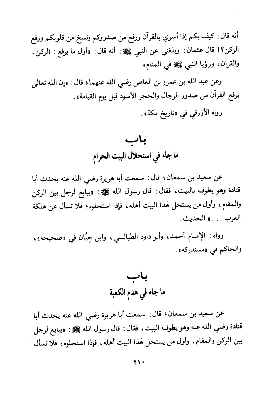 عن سعيد بن سمعان؛ قال: سمعت أبا هريرة رضي الله عنه يحدث أبا قتادة وهو يطوف بالبيت، فقال: قال رسول الله صلى الله عليه وسلم: «يبايع لرجل بين الركن والمقام، وأول من يستحل هذا البيت أهله، فإذا استحلوه؛ فلا تسأل عن هلكه العرب» ... الحديث.