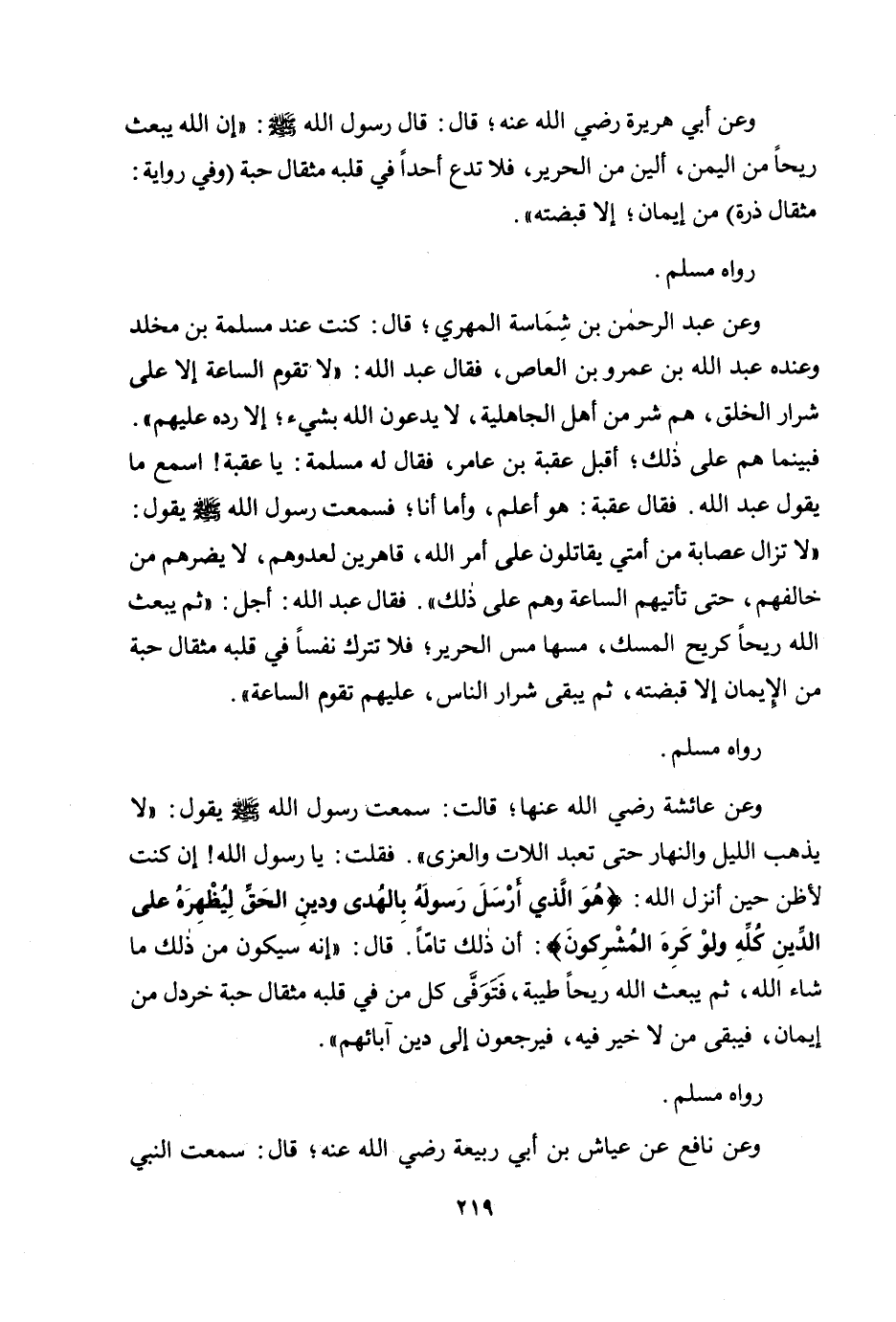 وعن عبد الرحمن بن شماسة المهري؛ قال: كنت عند مسلمة بن مخلد وعنده عبد الله بن عمرو بن العاص، فقال عبد الله: «لا تقوم الساعة إلا على شرار الخلق، هم شر من أهل الجاهلية، لا يدعون الله بشيء؛ إلا رده عليهم". فبينما هم على ذلك؛ أقبل عقبة بن عامر، فقال له مسلمة: يا عقبة! اسمع ما يقول عبد الله. فقال عقبة: هو أعلم، وأما أنا؛ فسمعت رسول الله صلى الله عليه وسلم يقول: " لا تزال عصابة من أمتي يقاتلون على أمر الله، قاهرين لعدوهم، لا يضرهم من خالفهم، حتى تأتيهم الساعة وهم على ذلك". فقال عبد الله: أجل: "ثم يبعث الله ريحا كريح المسك، مسها مس الحرير؛ فلا تترك نفسا في قلبه مثقال حبة من الإيمان إلا قبضته، ثم يبقى شرار الناس، عليهم تقوم الساعة» .