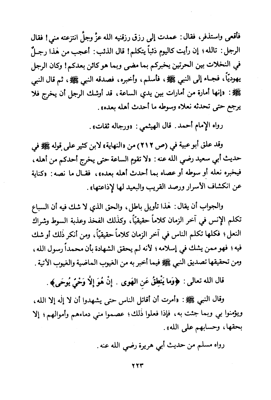 والجواب أن يقال: هذا تأويل باطل، والحق الذي لا شك فيه أن السباع تكلم الإنس في آخر الزمان كلاما حقيقيا، وكذلك الفخذ وعذبة السوط وشراك النعل؛ فكلها تكلم الناس في آخر الزمان كلاما حقيقيا، ومن أنكر ذلك أو شك فيه؛ فهو ممن يشك في إسلامه؛ لأنه لم يحقق الشهادة بأن محمدا رسول الله، ومن تحقيقها تصديق النبي صلى الله عليه وسلم فيما أخبر به من الغيوب الماضية والغيوب الآتية.