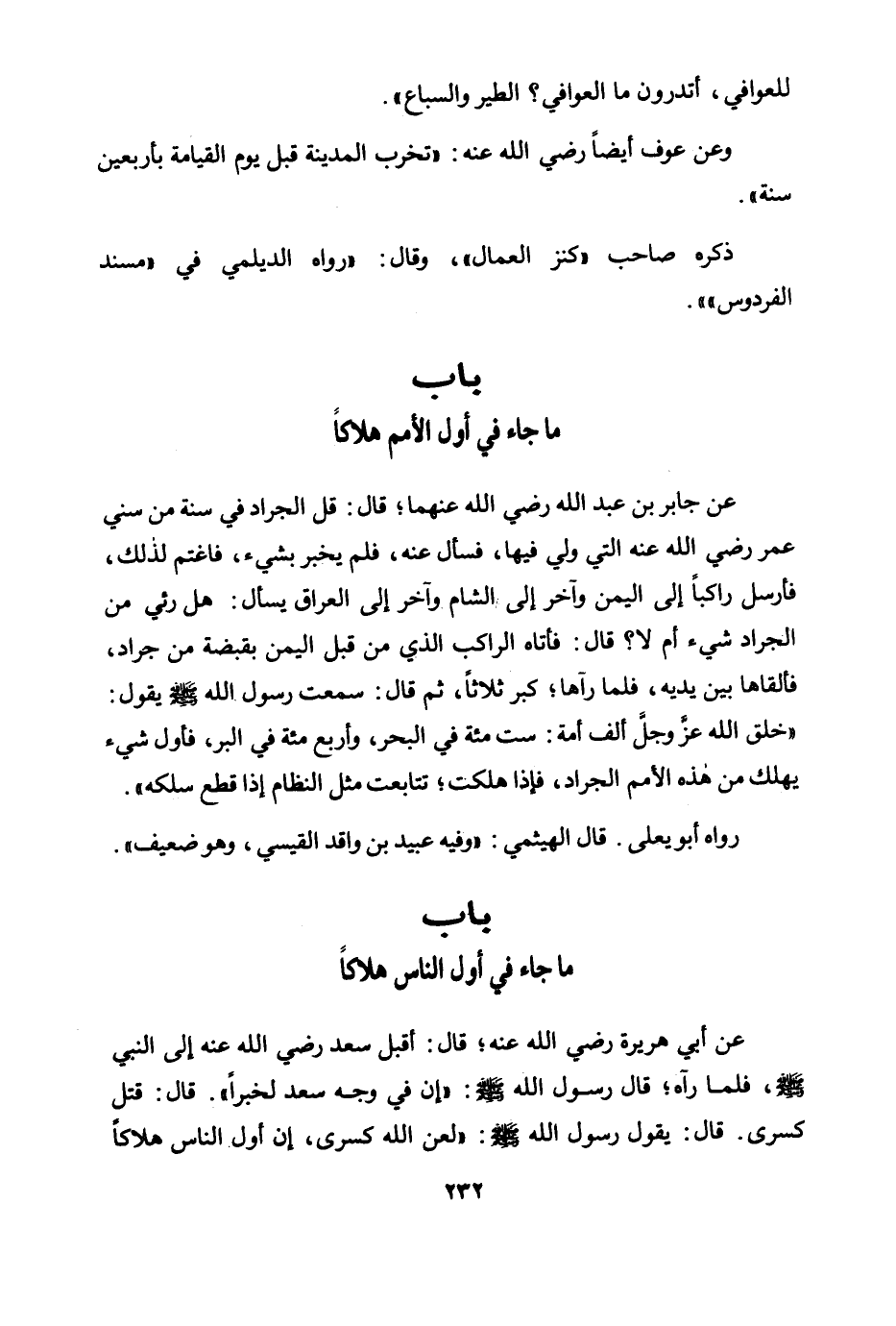 عن جابر بن عبد الله رضي الله عنهما؛ قال: قل الجراد في سنة من سني عمر رضي الله عنه التي ولي فيها، فسأل عنه، فلم يخبر بشيء، فاغتم لذلك، فأرسل راكبا إلى اليمن وآخر إلى الشام وآخر إلى العراق يسأل: هل رئي من الجراد شيء أم لا؟ قال: فأتاه الراكب الذي من قبل اليمن بقبضة من جراد، فألقاها بين يديه، فلما رآها؛ كبر ثلاثا، ثم قال: سمعت رسول الله صلى الله عليه وسلم يقول: «خلق الله عز وجل ألف أمة: ست مائة في البحر، وأربع مائة في البر، فأول شيء يهلك من هذه الأمم الجراد، فإذا هلكت؛ تتابعت مثل النظام إذا قطع سلكه» .