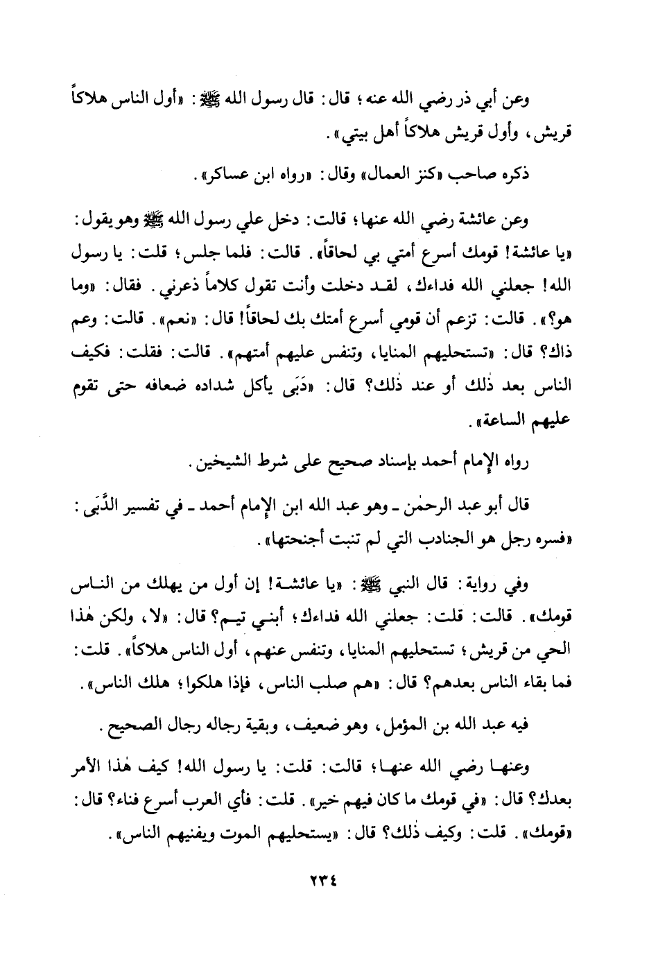 وعن عائشة رضي الله عنها؛ قالت: «دخل علي رسول الله صلى الله عليه وسلم وهو يقول: " يا عائشة! قومك أسرع أمتي بي لحاقا". قالت: فلما جلس؛ قلت: يا رسول الله! جعلني الله فداءك، لقد دخلت وأنت تقول كلاما ذعرني. فقال: "وما هو؟ ". قالت: تزعم أن قومي أسرع أمتك بك لحاقا! قال: "نعم". قالت: وعم ذاك؟ قال: "تستحليهم المنايا، وتنفس عليهم أمتهم". قالت: فقلت: فكيف الناس بعد ذلك أو عند ذلك؟ قال: "دبى يأكل شداده ضعافه حتى تقوم عليهم الساعة» .