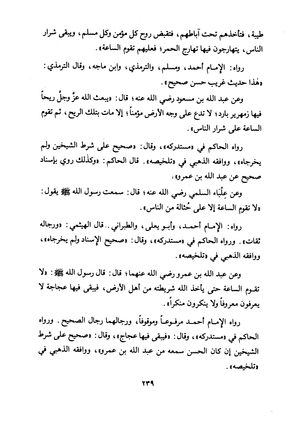 رواه الإمام أحمد مرفوعا وموقوفا، ورجالهما رجال الصحيح. ورواه الحاكم في "مستدركه"، وقال: "فيبقى فيها عجاج"، وقال: "صحيح على شرط الشيخين إن كان الحسن سمعه من عبد الله بن عمرو "، ووافقه الذهبي في "تلخيصه".