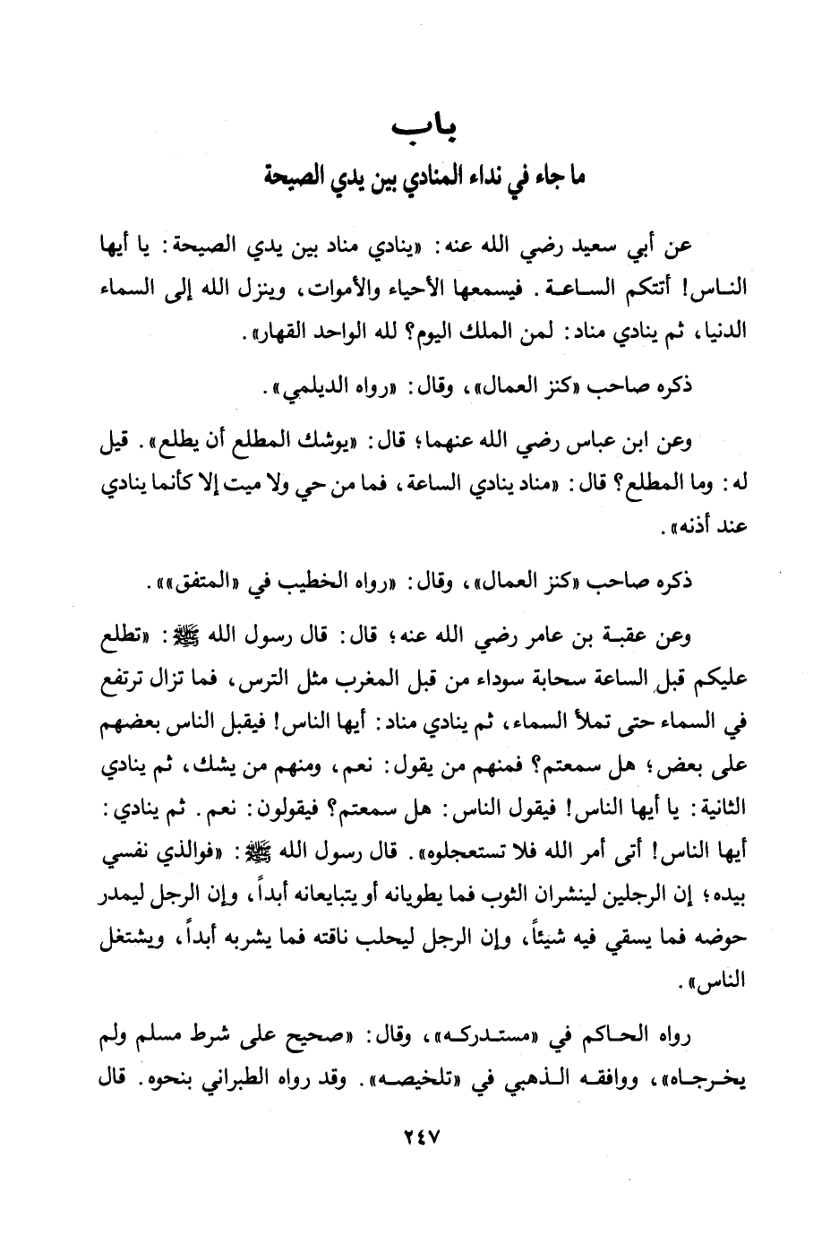 عن أبي سعيد رضي الله عنه: "ينادي مناد بين يدي الصيحة: يا أيها الناس! أتتكم الساعة. فيسمعها الأحياء والأموات، وينزل الله إلى السماء الدنيا، ثم ينادي مناد: لمن الملك اليوم؟ لله الواحد القهار".