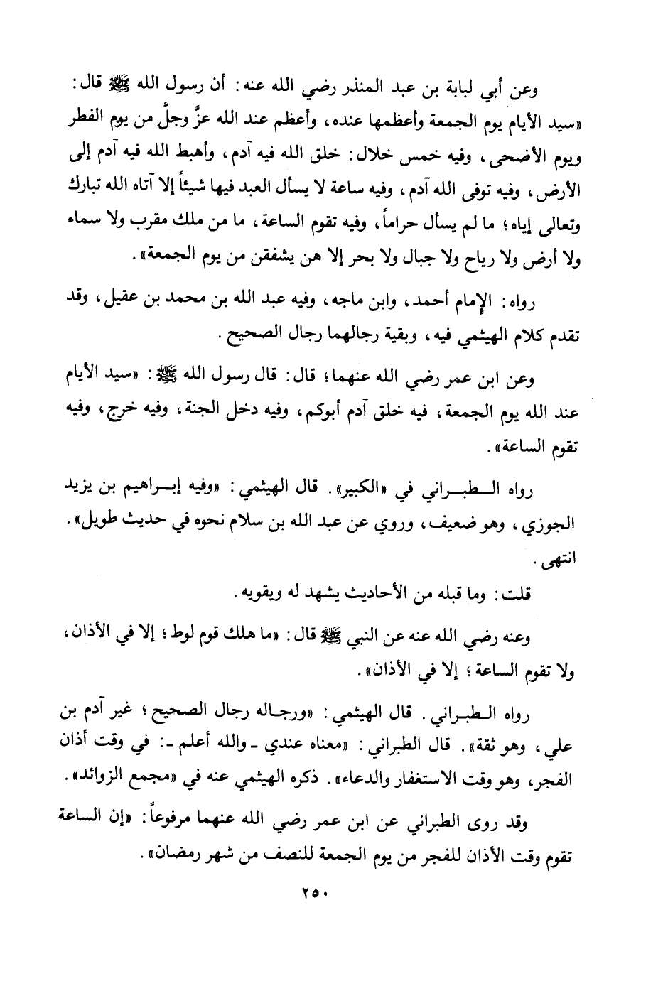 وعن أبي لبابة بن عبد المنذر رضي الله عنه: أن رسول الله صلى الله عليه وسلم قال: «سيد الأيام يوم الجمعة وأعظمها عنده، وأعظم عند الله عز وجل من يوم الفطر ويوم الأضحى، وفيه خمس خلال: خلق الله فيه آدم، وأهبط الله فيه آدم إلى الأرض، وفيه توفى الله آدم، وفيه ساعة لا يسأل العبد فيها شيئا إلا آتاه الله تبارك وتعالى إياه؛ ما لم يسأل حراما، وفيه تقوم الساعة، ما من ملك مقرب ولا سماء ولا أرض ولا رياح ولا جبال ولا بحر إلا هن يشفقن من يوم الجمعة» .