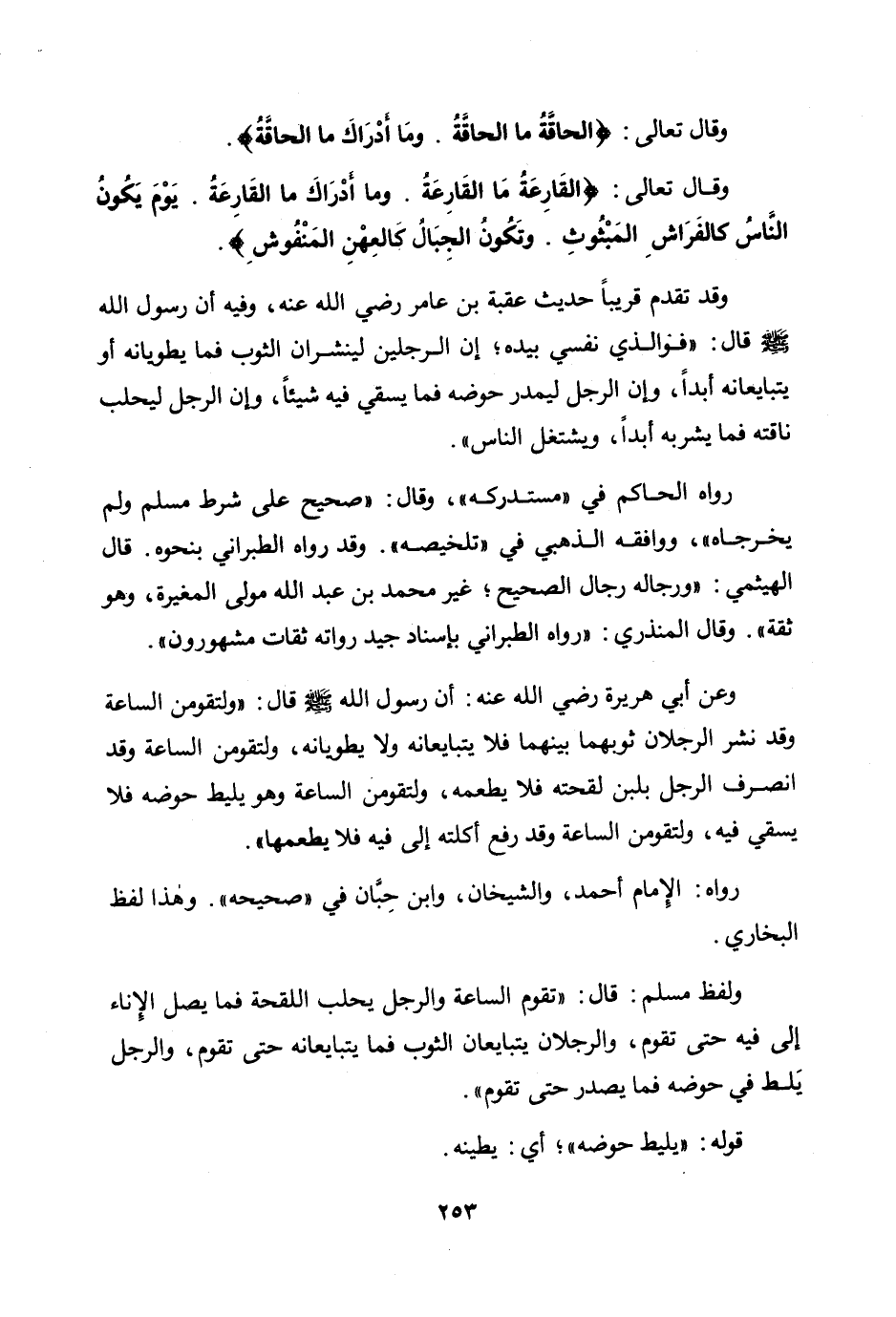 وقد تقدم قريبا حديث عقبة بن عامر رضي الله عنه، وفيه أن رسول الله صلى الله عليه وسلم قال: «فوالذي نفسي بيده؛ إن الرجلين لينشران الثوب فما يطويانه أو يتبايعانه أبدا، وإن الرجل ليمدر حوضه فما يسقي فيه شيئا، وإن الرجل ليحلب ناقته فما يشربه أبدا، ويشتغل الناس» .