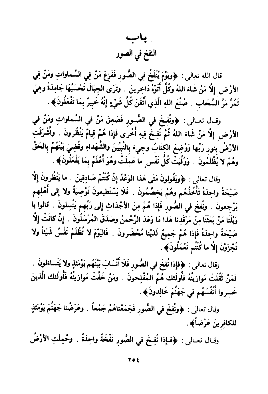 وقال تعالى: {وَنُفِخَ فِي الصُّورِ فَصَعِقَ مَنْ فِي السَّمَاوَاتِ وَمَنْ فِي الْأَرْضِ إِلَّا مَنْ شَاءَ اللَّهُ ثُمَّ نُفِخَ فِيهِ أُخْرَى فَإِذَا هُمْ قِيَامٌ يَنْظُرُونَ وَأَشْرَقَتِ الْأَرْضُ بِنُورِ رَبِّهَا وَوُضِعَ الْكِتَابُ وَجِيءَ بِالنَّبِيِّينَ وَالشُّهَدَاءِ وَقُضِيَ بَيْنَهُمْ بِالْحَقِّ وَهُمْ لَا يُظْلَمُونَ وَوُفِّيَتْ كُلُّ نَفْسٍ مَا عَمِلَتْ وَهُوَ أَعْلَمُ بِمَا يَفْعَلُونَ} .