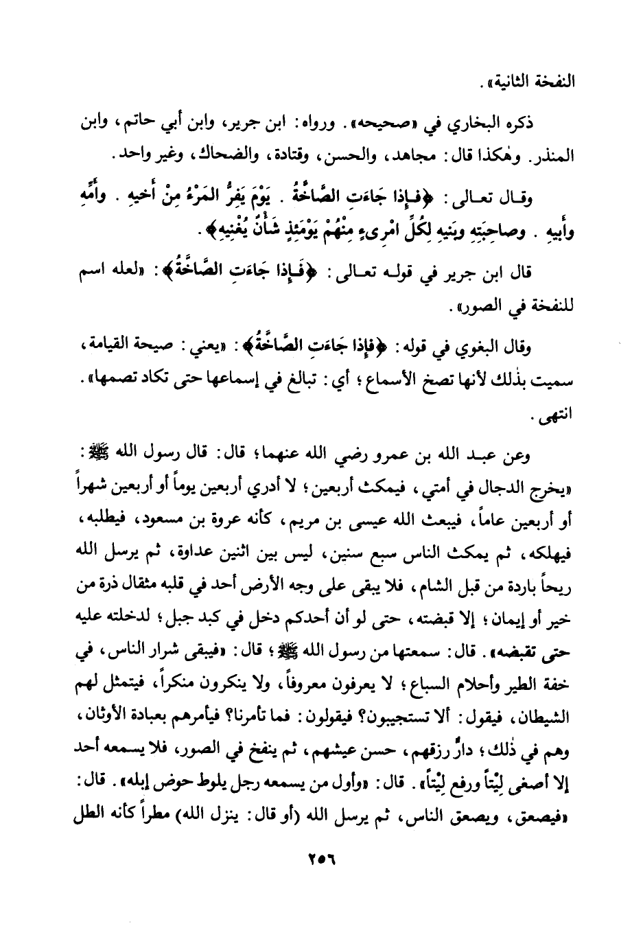 وعن عبد الله بن عمرو رضي الله عنهما؛ قال: قال رسول الله صلى الله عليه وسلم: «يخرج الدجال في أمتي، فيمكث أربعين؛ لا أدري أربعين يوما أو أربعين شهرا أو أربعين عاما، فيبعث الله عيسى ابن مريم، كأنه عروة بن مسعود، فيطلبه، فيهلكه، ثم يمكث الناس سبع سنين، ليس بين اثنين عداوة، ثم يرسل الله ريحا باردة من قبل الشام، فلا يبقى على وجه الأرض أحد في قلبه مثقال ذرة من خير أو إيمان؛ إلا قبضته، حتى لو أن أحدكم دخل في كبد جبل؛ لدخلته عليه حتى تقبضه". قال: سمعتها من رسول الله صلى الله عليه وسلم؛ قال: "فيبقي شرار الناس، في خفة الطير وأحلام السباع؛ لا يعرفون معروفا، ولا ينكرون منكرا، فيتمثل لهم الشيطان، فيقول: ألا تستجيبون؟ فيقولون: فما تأمرونا؟ فيأمرهم بعبادة الأوثان، وهم في ذلك؛ دارٌّ رزقهم، حسن عيشهم، ثم ينفخ في الصور، فلا يسمعه أحد إلا أصغى ليتا ورفع ليتا". قال: "وأول من يسمعه رجل يلوط حوض إبله". قال: "فيصعق، ويصعق الناس، ثم يرسل الله (أو قال: ينزل الله) مطرا كأنه الطل»