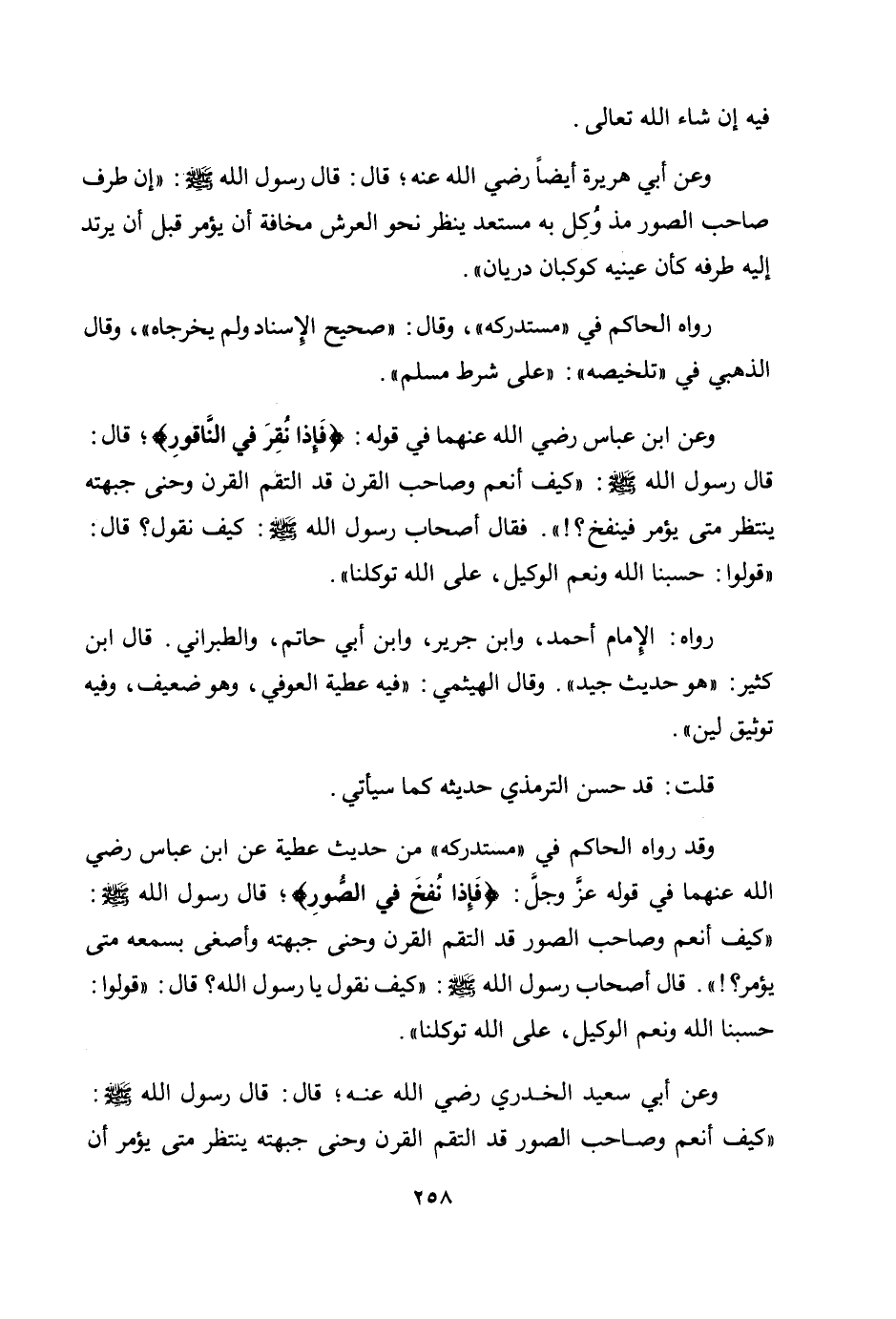 وقد رواه الحاكم في "مستدركه" من حديث عطية عن ابن عباس رضي الله عنهما في قوله عز وجل: {فَإِذَا نُفِخَ فِي الصُّورِ} ؛ قال: رسول الله صلى الله عليه وسلم: «كيف أنعم وصاحب الصور قد التقم القرن وحنى جبهته وأصغى بسمعه متى يؤمر؟! ". قال أصحاب رسول الله صلى الله عليه وسلم: كيف نقول يا رسول الله؟ قال: "قولوا: حسبنا الله ونعم الوكيل، على الله توكلنا» .