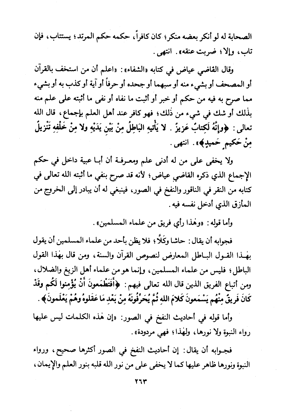 وقال القاضي عياض في كتابه "الشفاء": "اعلم أن من استخف بالقرآن أو المصحف أو بشيء منه أو سبهما أو جحده أو حرفا أو آية أو كذب به أو بشيء مما صرح به فيه من حكم أو خبر أو أثبت ما نفاه أو نفى ما أثبته على علم منه بذلك أو شك في شيء من ذلك؛ فهو كافر عند أهل العلم بإجماع، قال الله تعالى: {وَإِنَّهُ لَكِتَابٌ عَزِيزٌ لَا يَأْتِيهِ الْبَاطِلُ مِنْ بَيْنِ يَدَيْهِ وَلَا مِنْ خَلْفِهِ تَنْزِيلٌ مِنْ حَكِيمٍ حَمِيدٍ} ". انتهى.