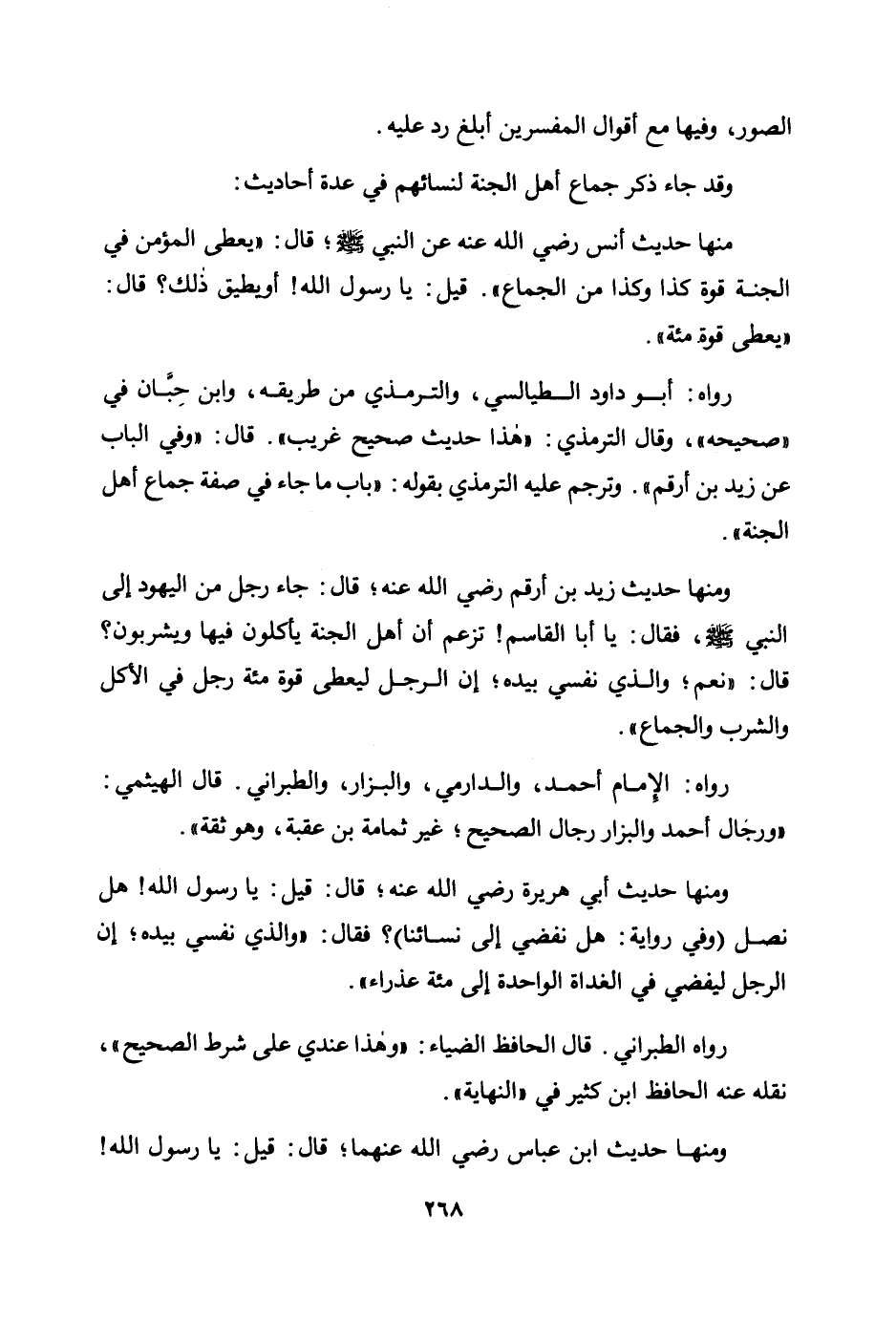 ومنها حديث زيد بن أرقم رضي الله عنه؛ قال «جاء رجل من اليهود إلى النبي صلى الله عليه وسلم، فقال: يا أبا القاسم! تزعم أن أهل الجنة يأكلون فيها ويشربون؟ قال: "نعم؛ والذي نفسي بيده؛ إن الرجل ليعطى قوة مائة رجل في الأكل والشرب والجماع» .