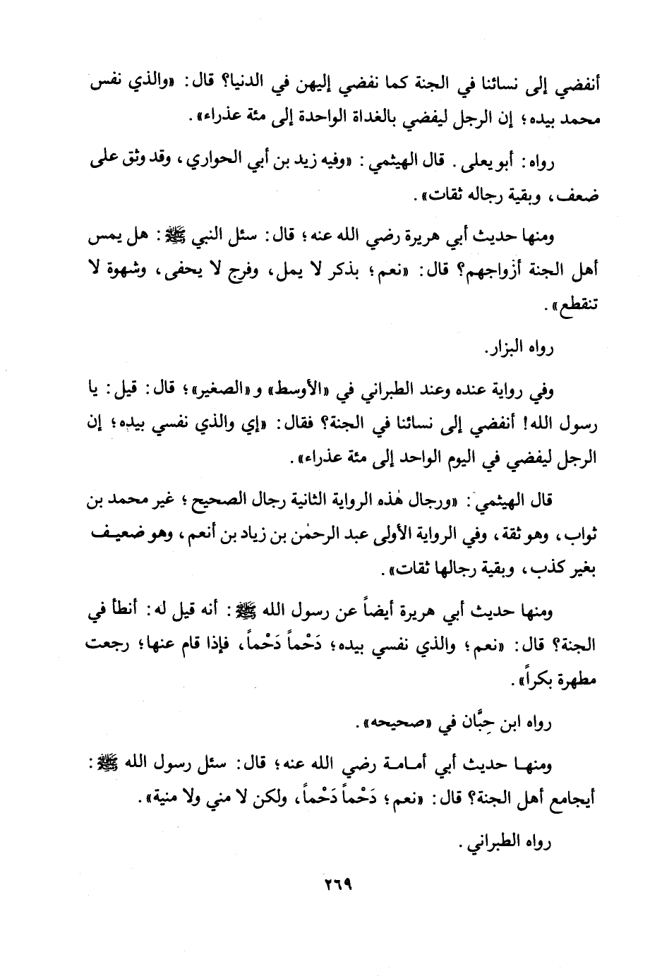 ومنها حديث أبي هريرة رضي الله عنه؛ قال: «سئل النبي صلى الله عليه وسلم: هل يمس أهل الجنة أزواجهم؟ قال: "نعم؛ بذكر لا يمل، وفرج لا يحفى، وشهوة لا تنقطع» .