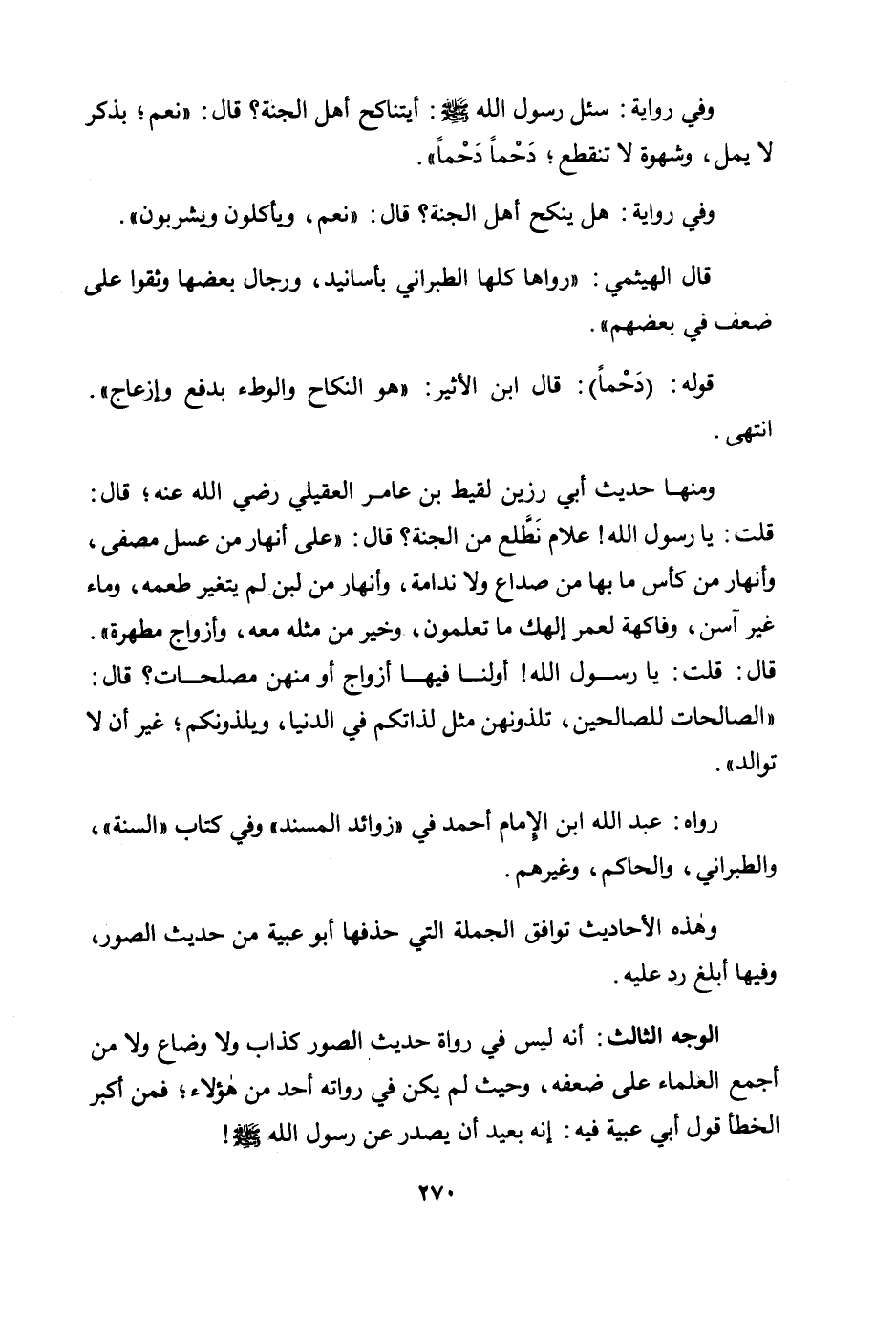 ومنها حديث أبي رزين لقيط بن عامر العقيلي رضي الله عنه؛ قال: «قلت: يا رسول الله! علام نطلع من الجنة؟ قال: "على أنهار من عسل مصفى، وأنهار من كأس ما بها من صداع ولا ندامة، وأنهار من لبن لم يتغير طعمه، وماء غير آسن، وفاكهة لعمر إلهك ما تعلمون، وخير من مثله معه، وأزواج مطهرة". قال: قلت: يا رسول الله! أولنا فيها أزواج أو منهن مصلحات؟ قال: "الصالحات للصالحين، تلذونهن مثل لذاتكم في الدنيا، ويلذونكم؛ غير أن لا توالد» .