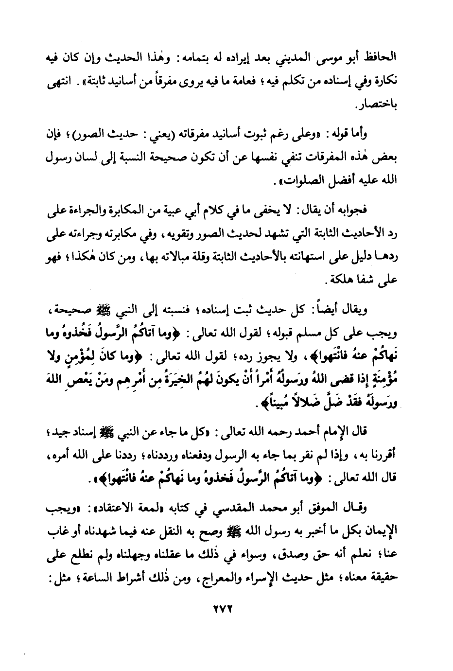وقال الموفق أبو محمد المقدسي في كتابه "لمعة الاعتقاد": "ويجب الإيمان بكل ما أخبر به رسول الله صلى الله عليه وسلم وصح به النقل عنه فيما شهدناه أو غاب عنا؛ نعلم أنه حق وصدق، وسواء في ذلك ما عقلناه وجهلناه ولم نطلع على حقيقة معناه؛ مثل حديث الإسراء والمعراج، ومن ذلك أشراط الساعة؛ مثل: