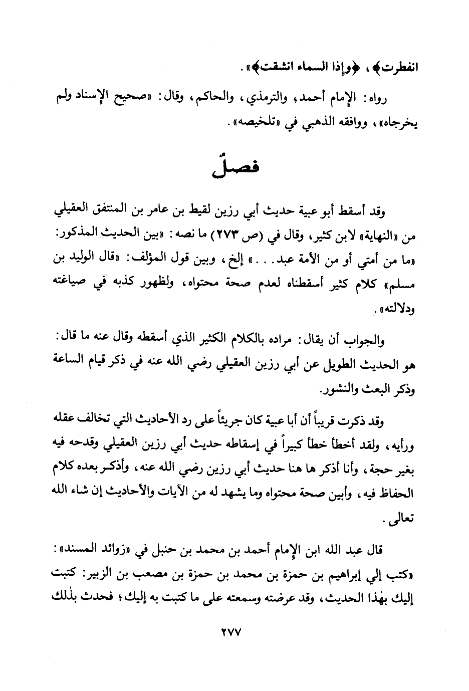 وقد أسقط أبو عبية حديث أبي رزين لقيط بن عامر بن المنتفق العقيلي من "النهاية" لابن كثير، وقال في (ص273) ما نصه: "بين الحديث المذكور: "ما من أمتي أو من الأمة عبد...." إلخ، وبين قول المؤلف: "قال الوليد بن مسلم " كلام كثير أسقطناه لعدم صحة محتواه، ولظهور كذبه في صياغته ودلالته".
