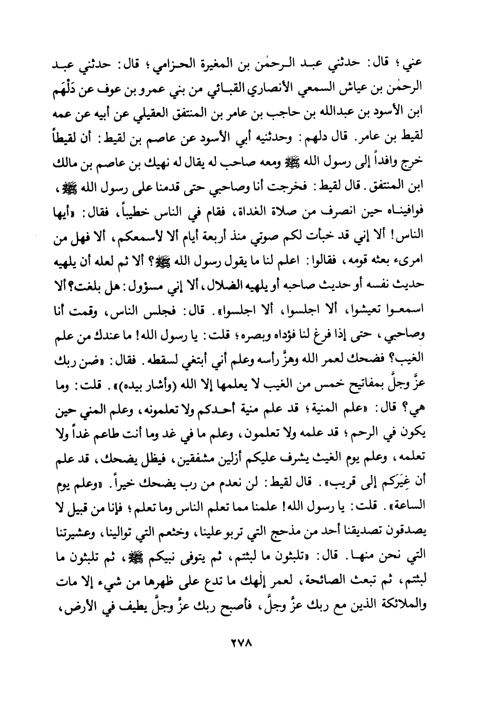 قلت: يا رسول الله! علمنا مما تعلم الناس وما تعلم؛ فإنا من قبيل لا يصدقون تصديقنا أحد من مذحج التي تربو علينا، وخثعم التي توالينا، وعشيرتنا التي نحن منها. قال: "تلبثون ما لبثتم، ثم يتوفى نبيكم صلى الله عليه وسلم، ثم تلبثون ما لبثتم، ثم تبعث الصائحة، لعمر إلهك ما تدع على ظهرها من شيء إلا مات والملائكة الذين مع ربك عز وجل، فأصبح ربك عز وجل يطيف في الأرض،»