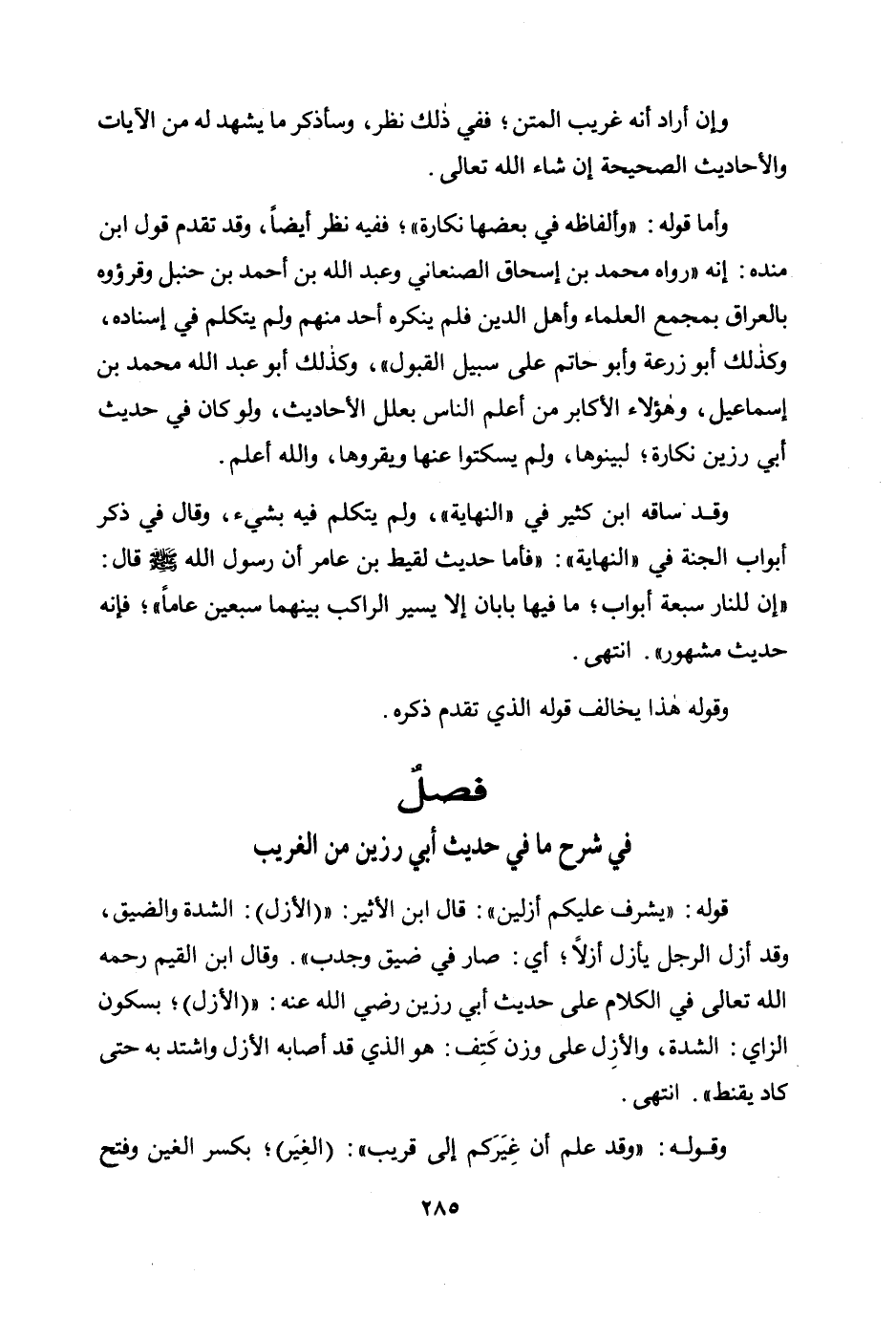 وأما قوله: "وألفاظه في بعضها نكارة"؛ ففيه نظر أيضا، وقد تقدم قول ابن منده: إنه "رواه محمد بن إسحاق الصنعاني وعبد الله بن أحمد بن حنبل وقرؤوه بالعراق بمجمع العلماء وأهل الدين فلم ينكره أحد منهم ولم يتكلم في إسناده، وكذلك أبو زرعة وأبو حاتم على سبيل القبول"، وكذلك أبو عبد الله محمد بن إسماعيل، وهؤلاء الأكابر من أعلم الناس بعلل الأحاديث، ولو كان في حديث أبي رزين نكارة؛ لبينوها، ولم يسكتوا عنها ويقروها، والله أعلم.