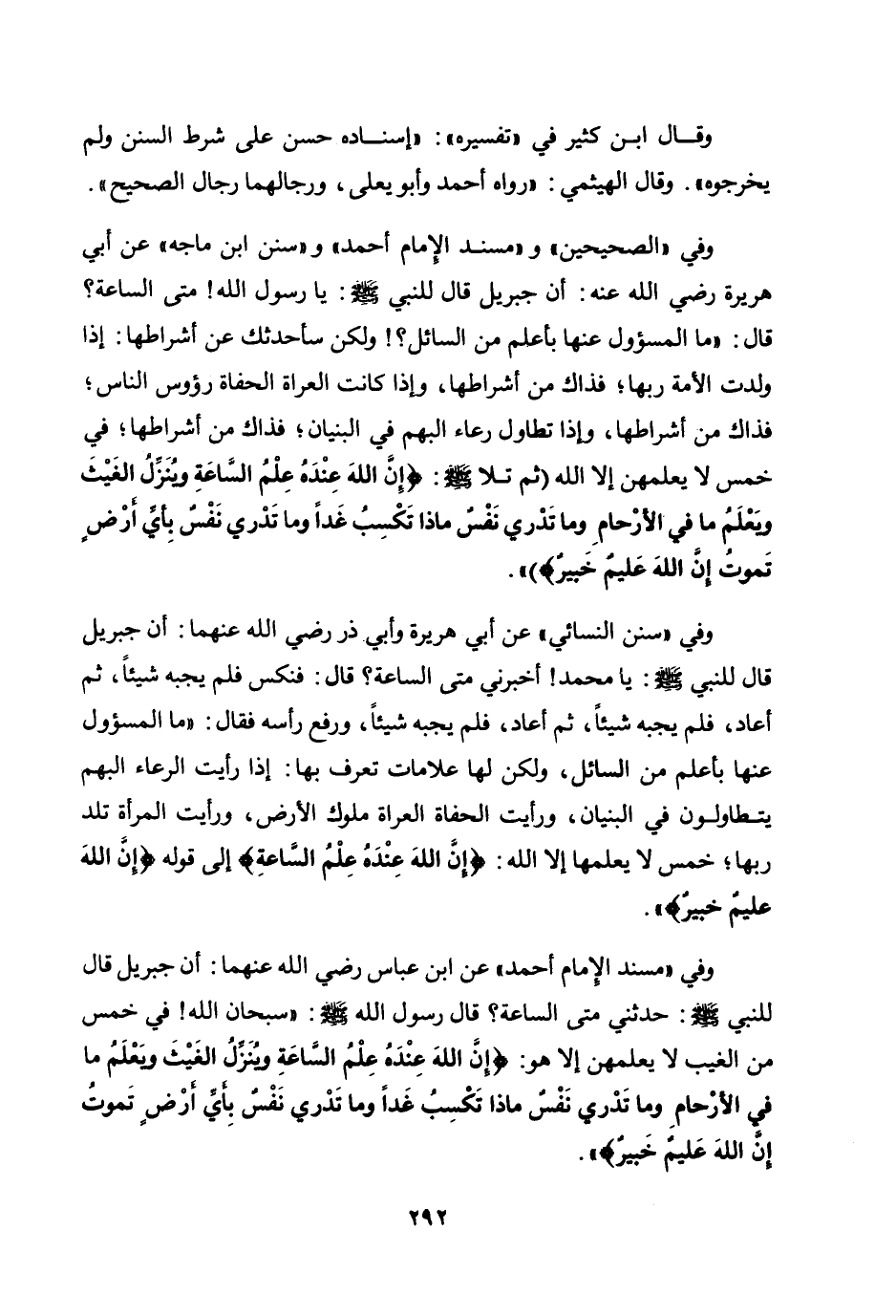 وفي "مسند الإمام أحمد " عن ابن عباس رضي الله عنهما: «أن جبريل قال للنبي صلى الله عليه وسلم: حدثني متى الساعة؟ قال رسول الله صلى الله عليه وسلم: "سبحان الله! في خمس من الغيب لا يعلمهن إلا هو: {إِنَّ اللَّهَ عِنْدَهُ عِلْمُ السَّاعَةِ وَيُنَزِّلُ الْغَيْثَ وَيَعْلَمُ مَا فِي الْأَرْحَامِ وَمَا تَدْرِي نَفْسٌ مَاذَا تَكْسِبُ غَدًا وَمَا تَدْرِي نَفْسٌ بِأَيِّ أَرْضٍ تَمُوتُ إِنَّ اللَّهَ عَلِيمٌ خَبِيرٌ} » .