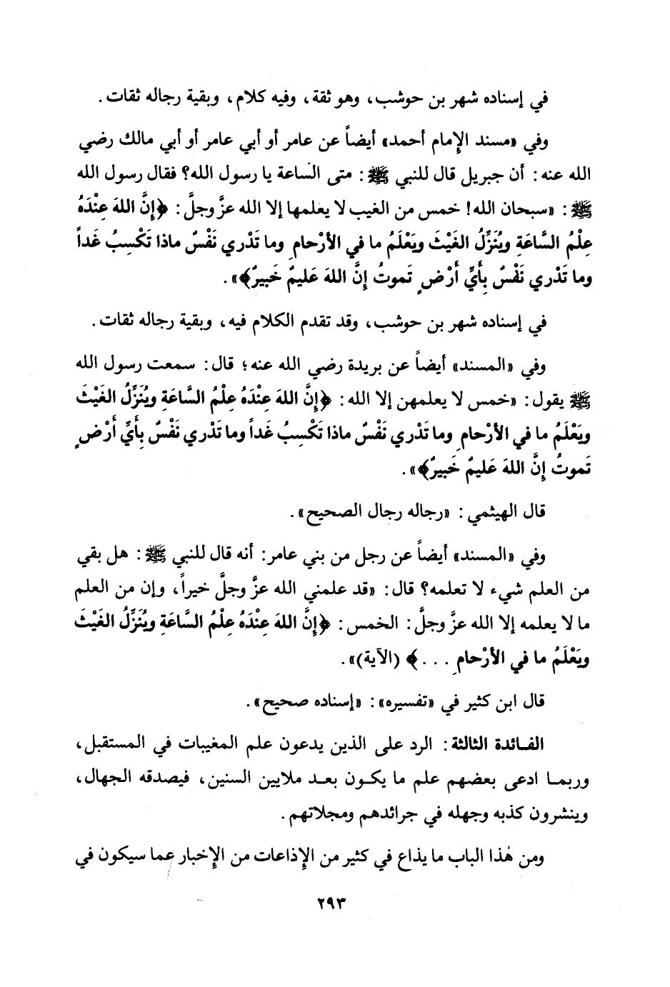 وفي "مسند الإمام أحمد " أيضا عن عامر أو أبي عامر أو أبي مالك رضي الله عنه: «أن جبريل قال للنبي صلى الله عليه وسلم: متى الساعة يا رسول الله؟ فقال رسول الله صلى الله عليه وسلم: "سبحان الله! خمس من الغيب لا يعلمها إلا الله عز وجل: {إِنَّ اللَّهَ عِنْدَهُ عِلْمُ السَّاعَةِ وَيُنَزِّلُ الْغَيْثَ وَيَعْلَمُ مَا فِي الْأَرْحَامِ وَمَا تَدْرِي نَفْسٌ مَاذَا تَكْسِبُ غَدًا وَمَا تَدْرِي نَفْسٌ بِأَيِّ أَرْضٍ تَمُوتُ إِنَّ اللَّهَ عَلِيمٌ خَبِيرٌ} » .